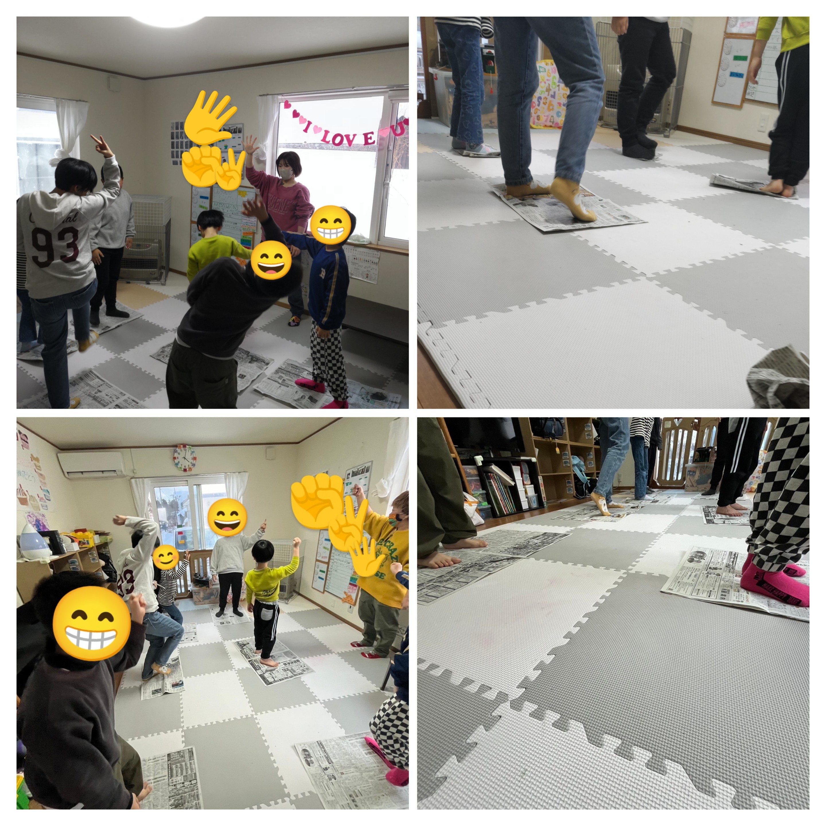 「新聞紙の下は海だから新聞紙から落ちないようにね!サメが沢山いるよ!!」