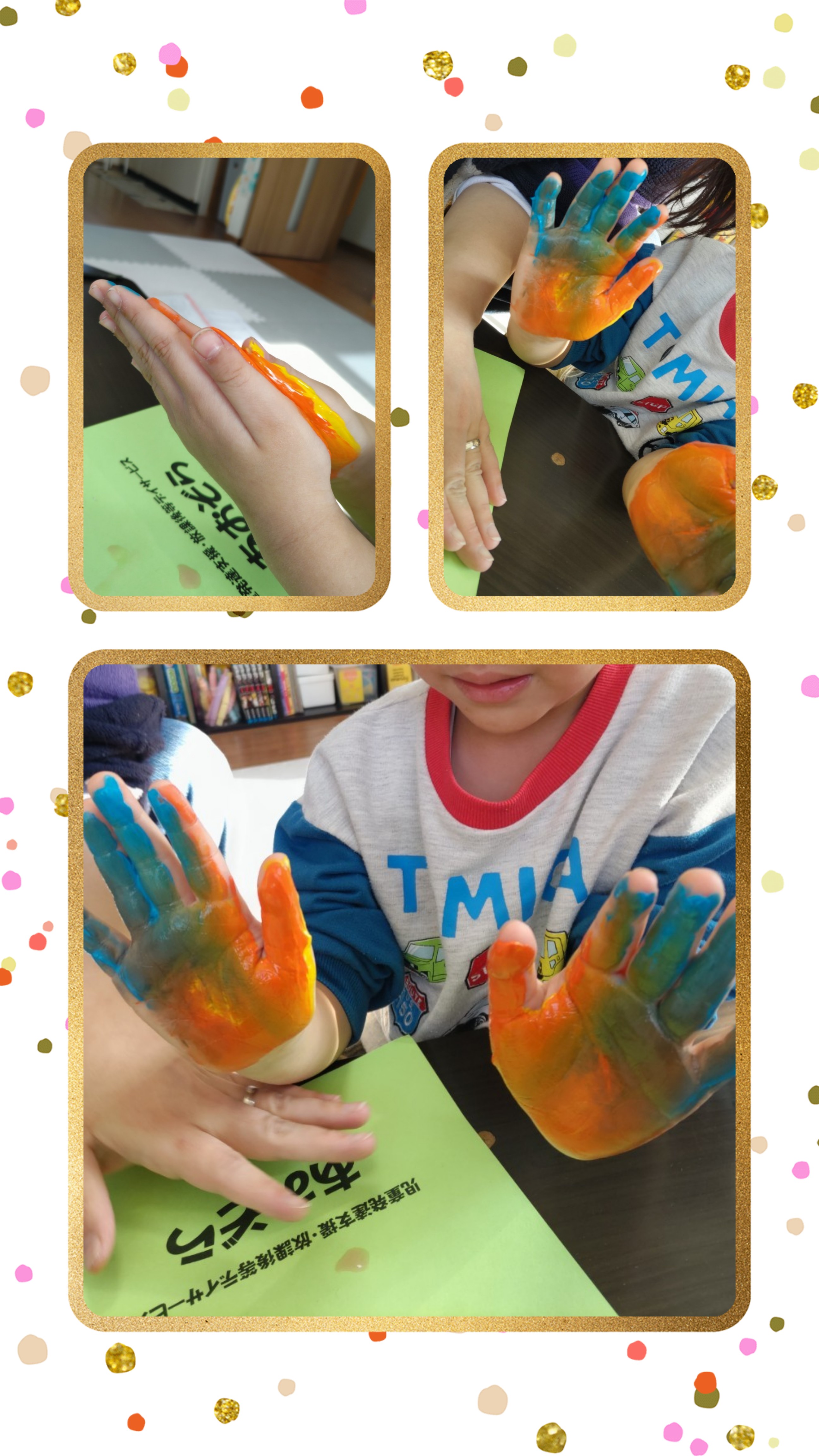 ペタ!と両手を重ねカラフルになった両手を画用紙の上にポンッ!!