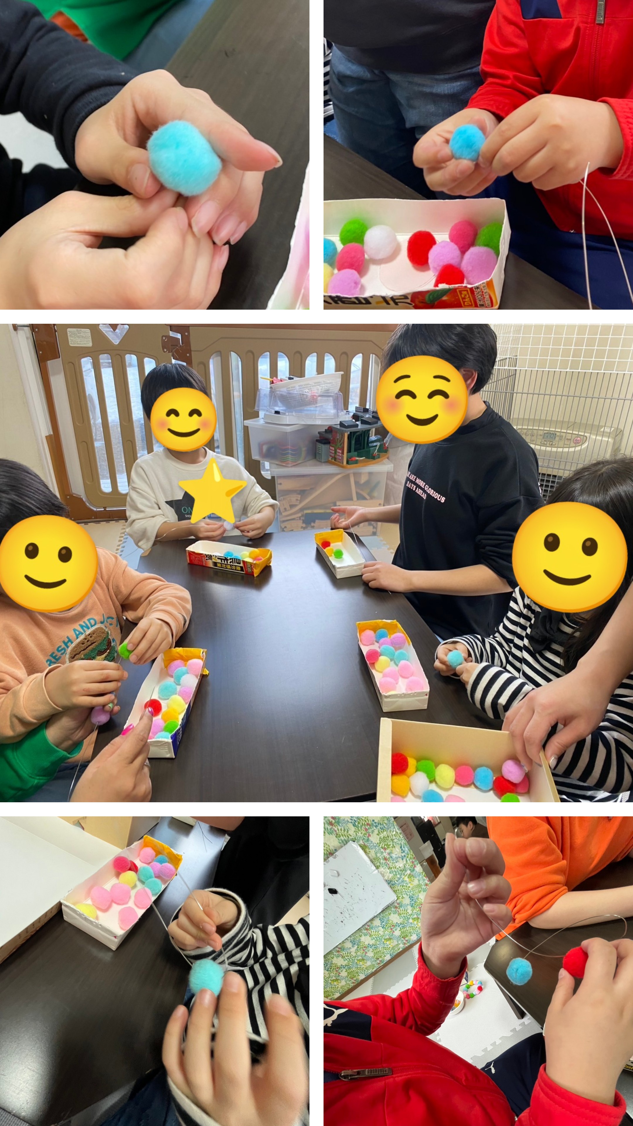 カラフルなモケモケ玉を針金に通しますよ〜(. ❛ ᴗ ❛.)