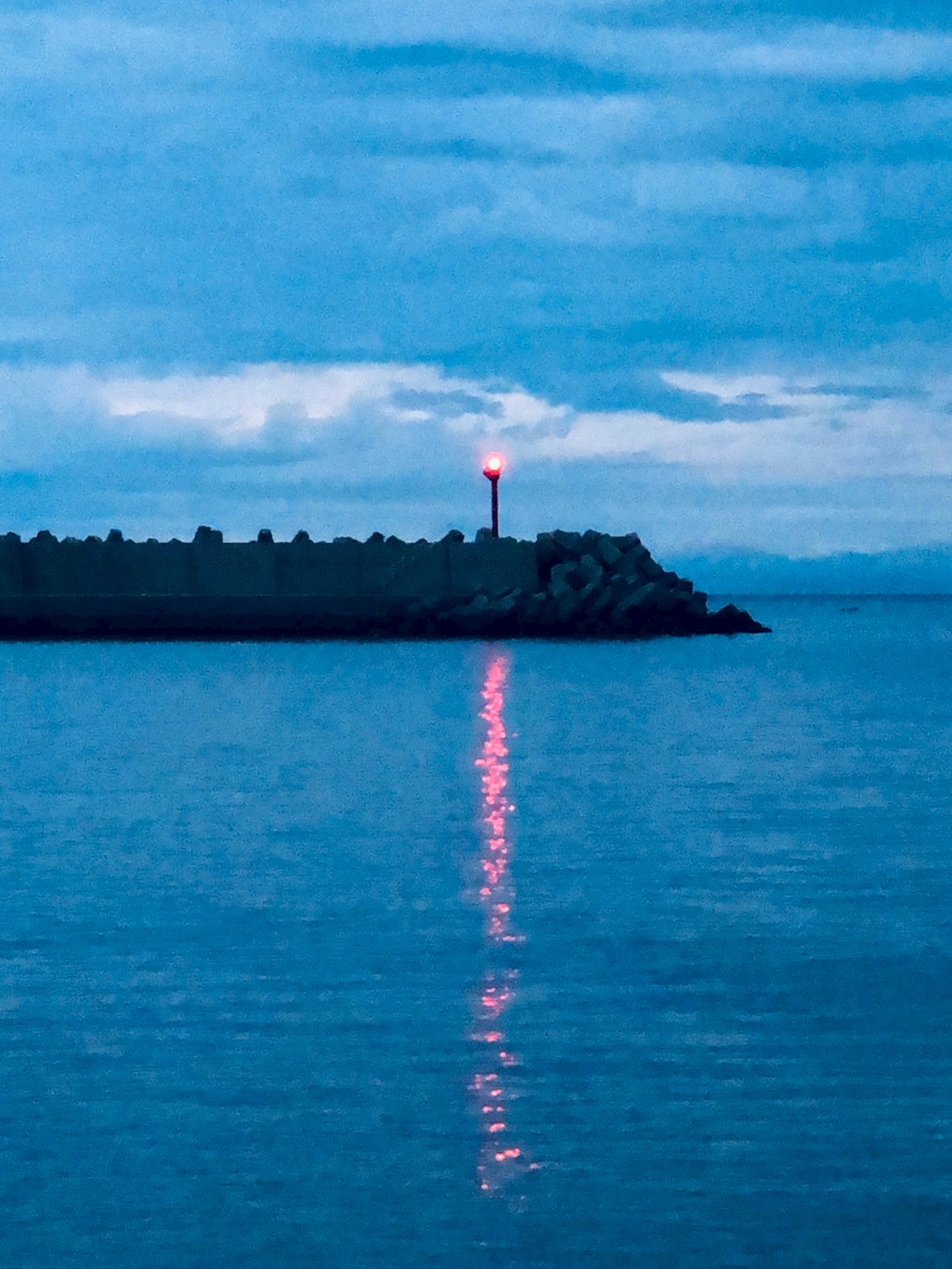 灯台の光が噴火湾水面に伸び赤い道ができてました(◍•ᴗ•◍)✧*。