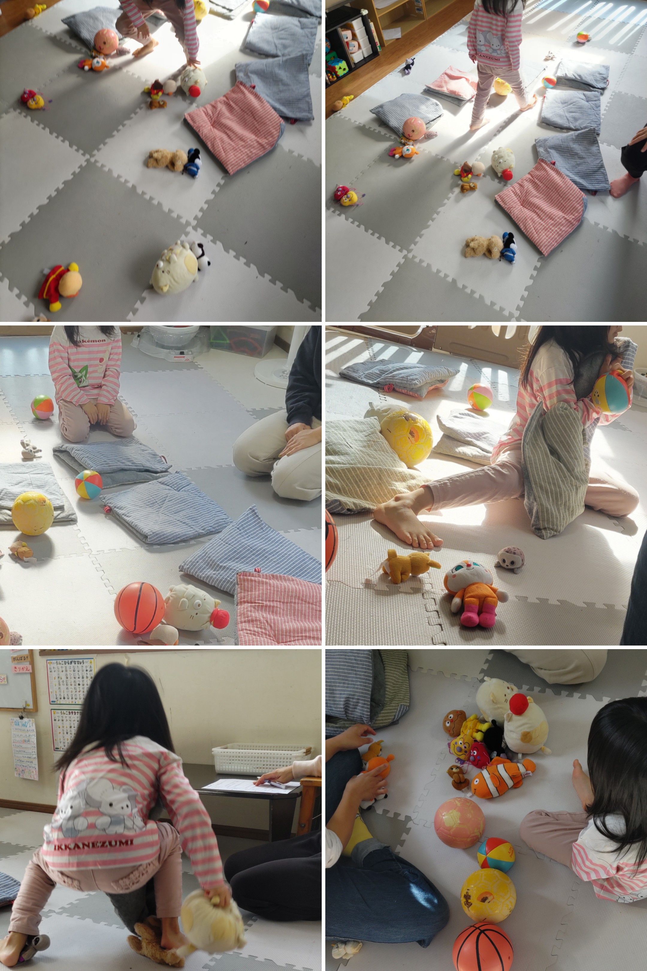 床に沢山のぬいぐるみや座布団が!!