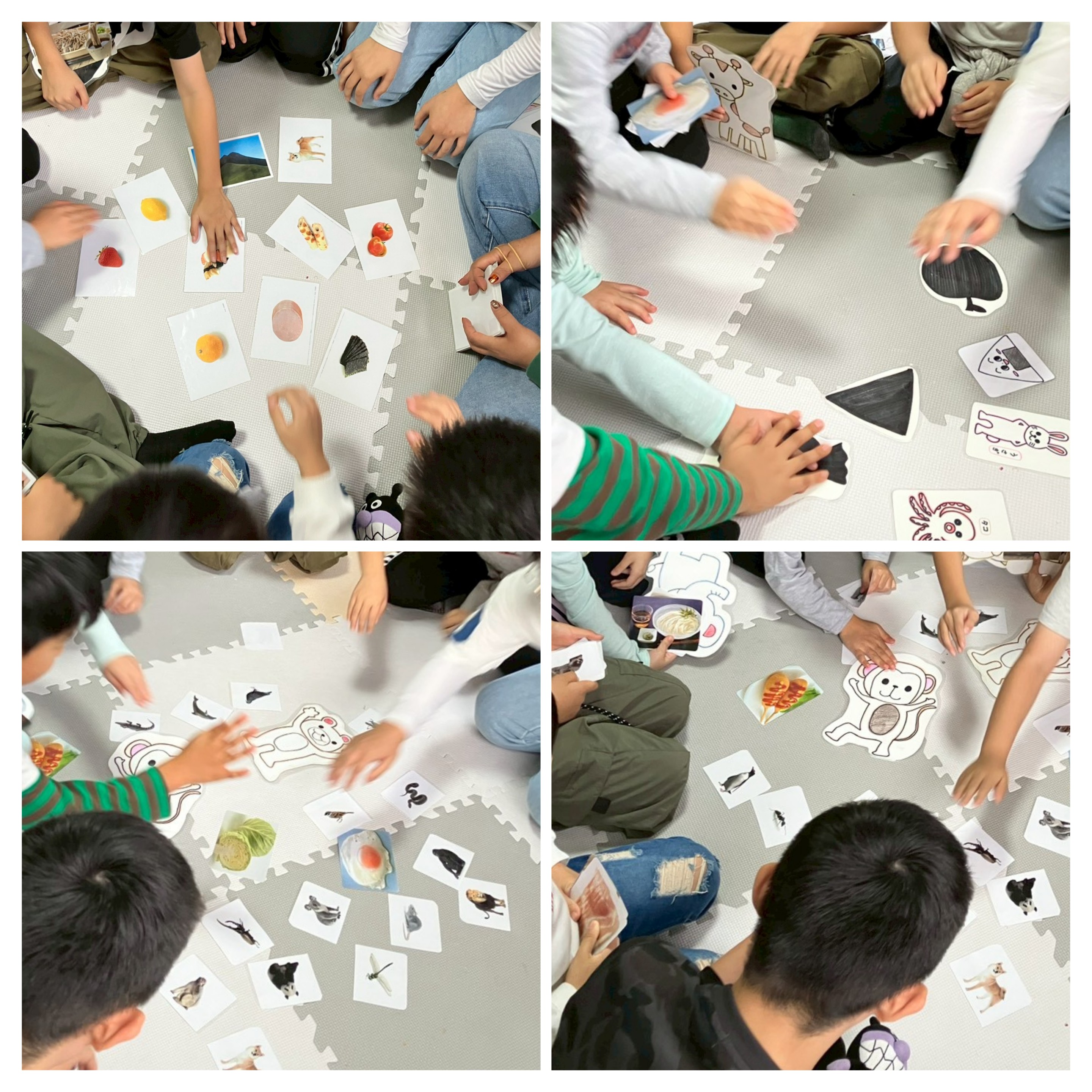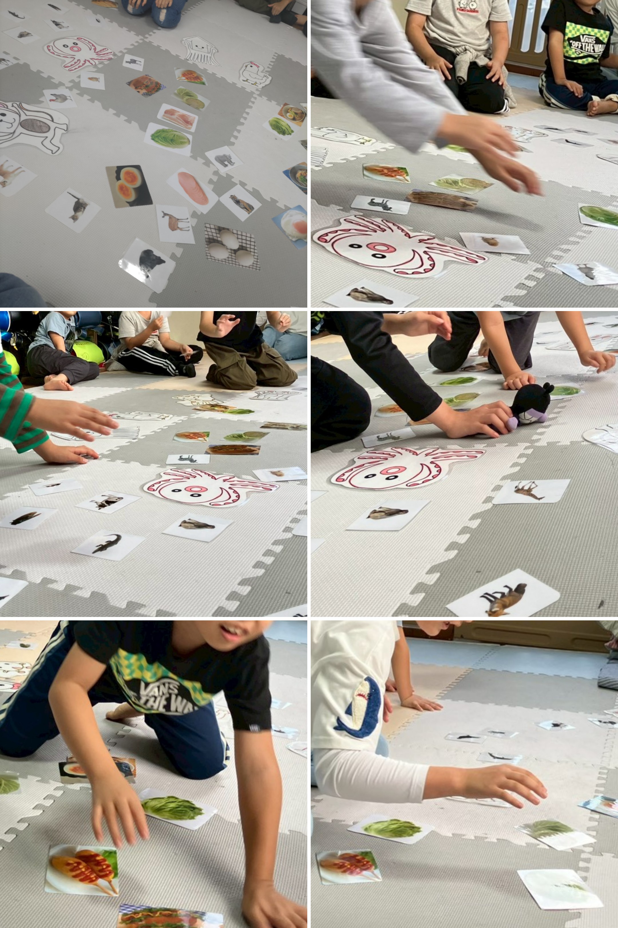 床に沢山並べれているカードには、動物や食べ物、海の生き物等あります。
