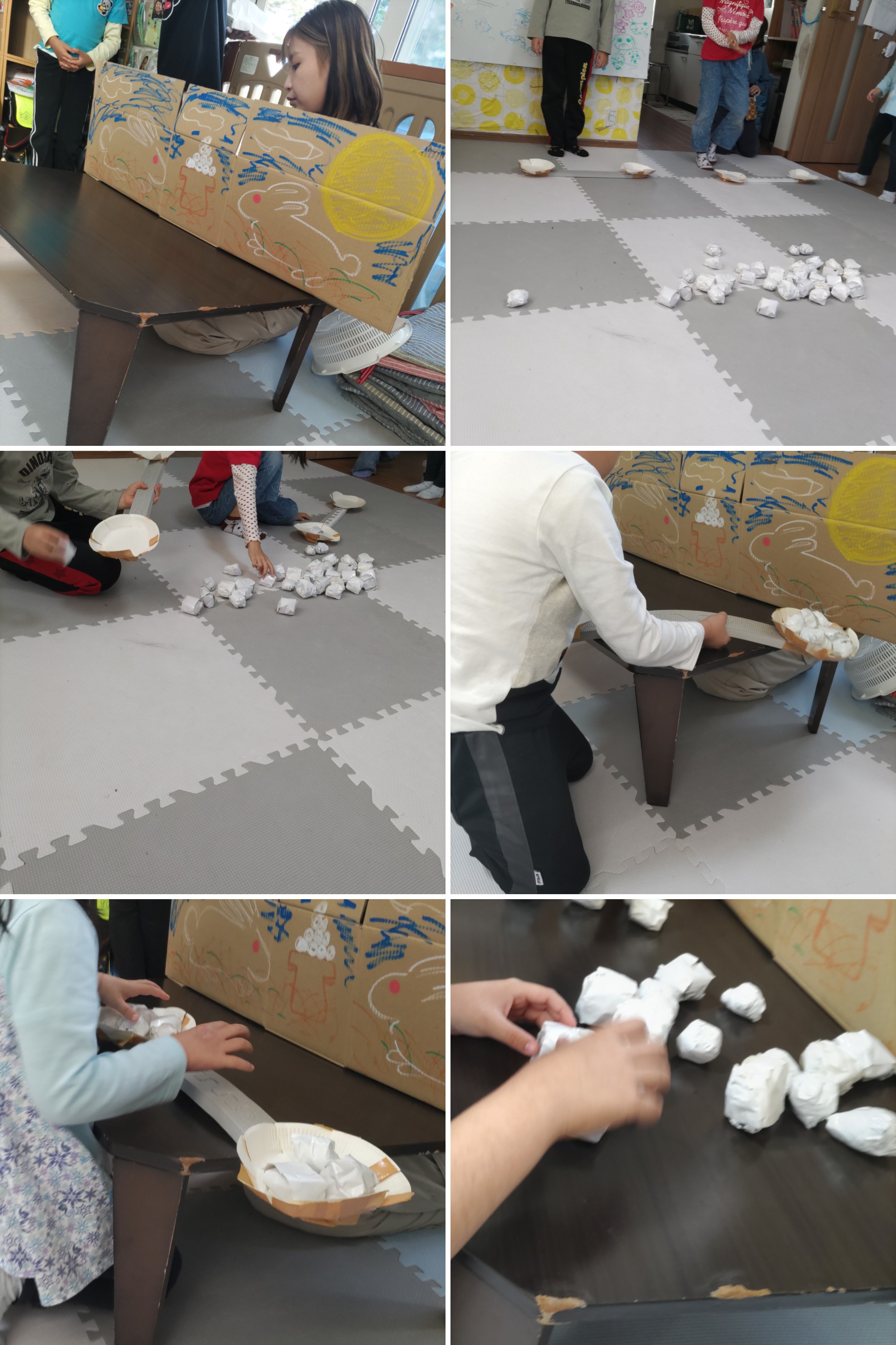 床には沢山の新聞紙を再利用したお団子がありウサギさんに届けなければなりません!!