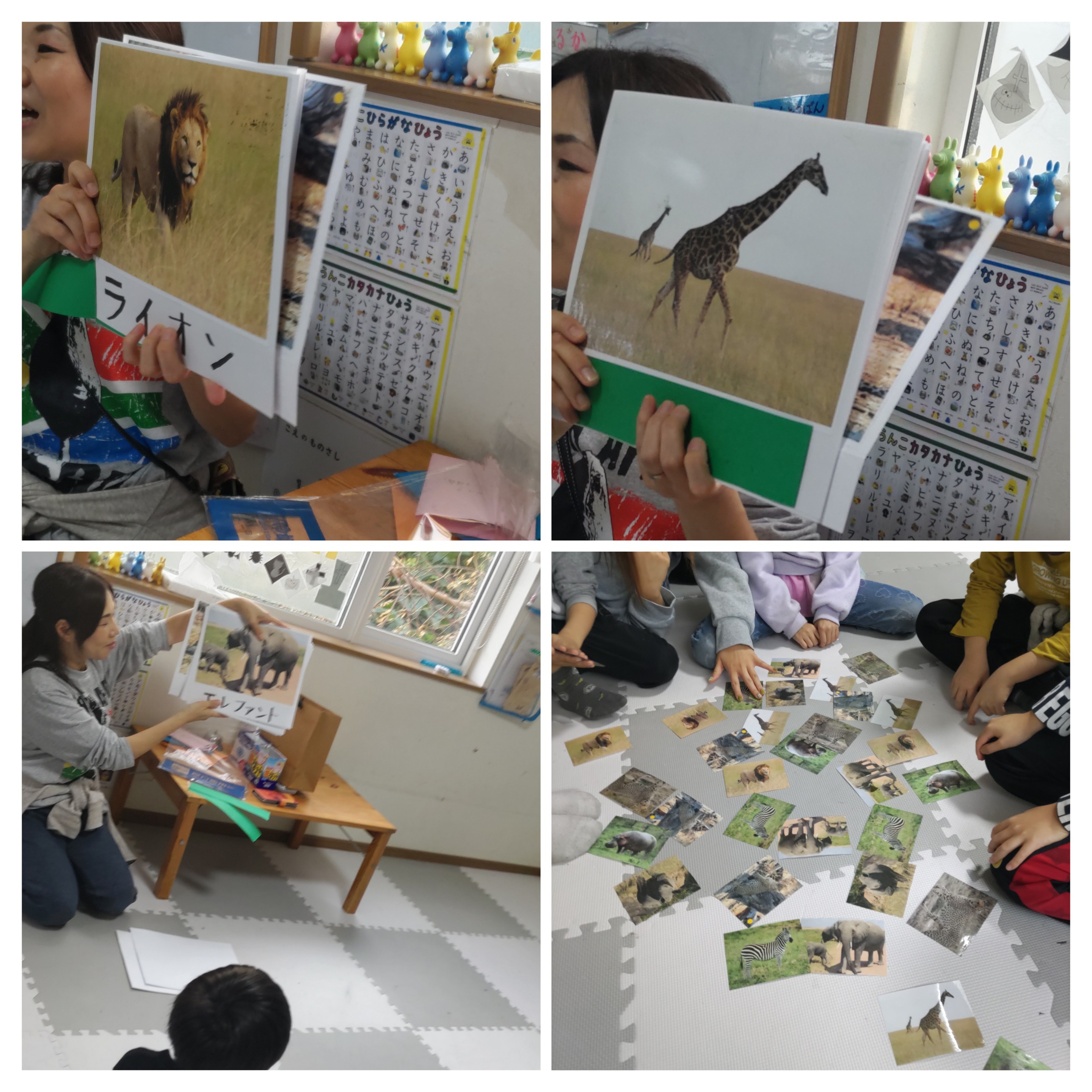 動物の名前を英語で覚えた後、動物英語読みカルタ開始!!