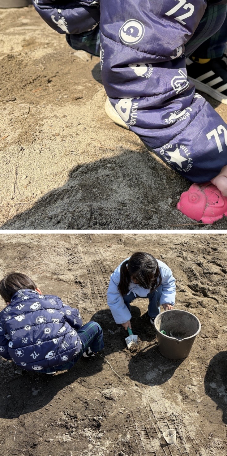 土にに触れる砂遊びは、人気でスコップを使って穴を掘ったり