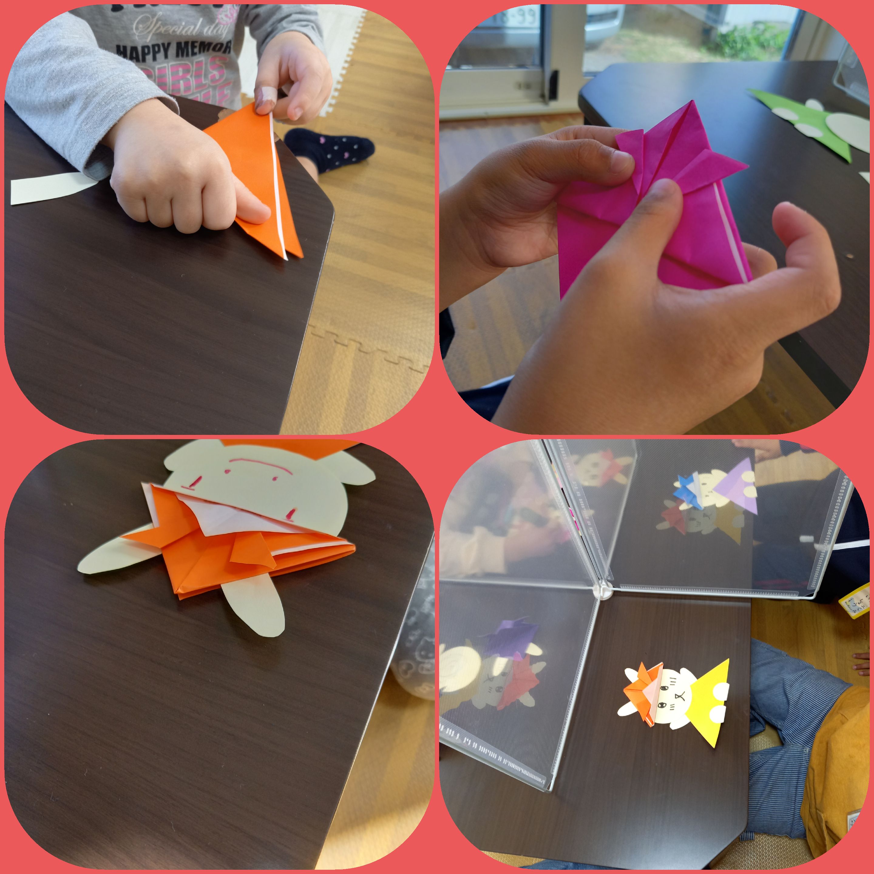 好きな折り紙の色を選び兜を作り、表情豊かなウサギさんの出来上がり( ^-^)