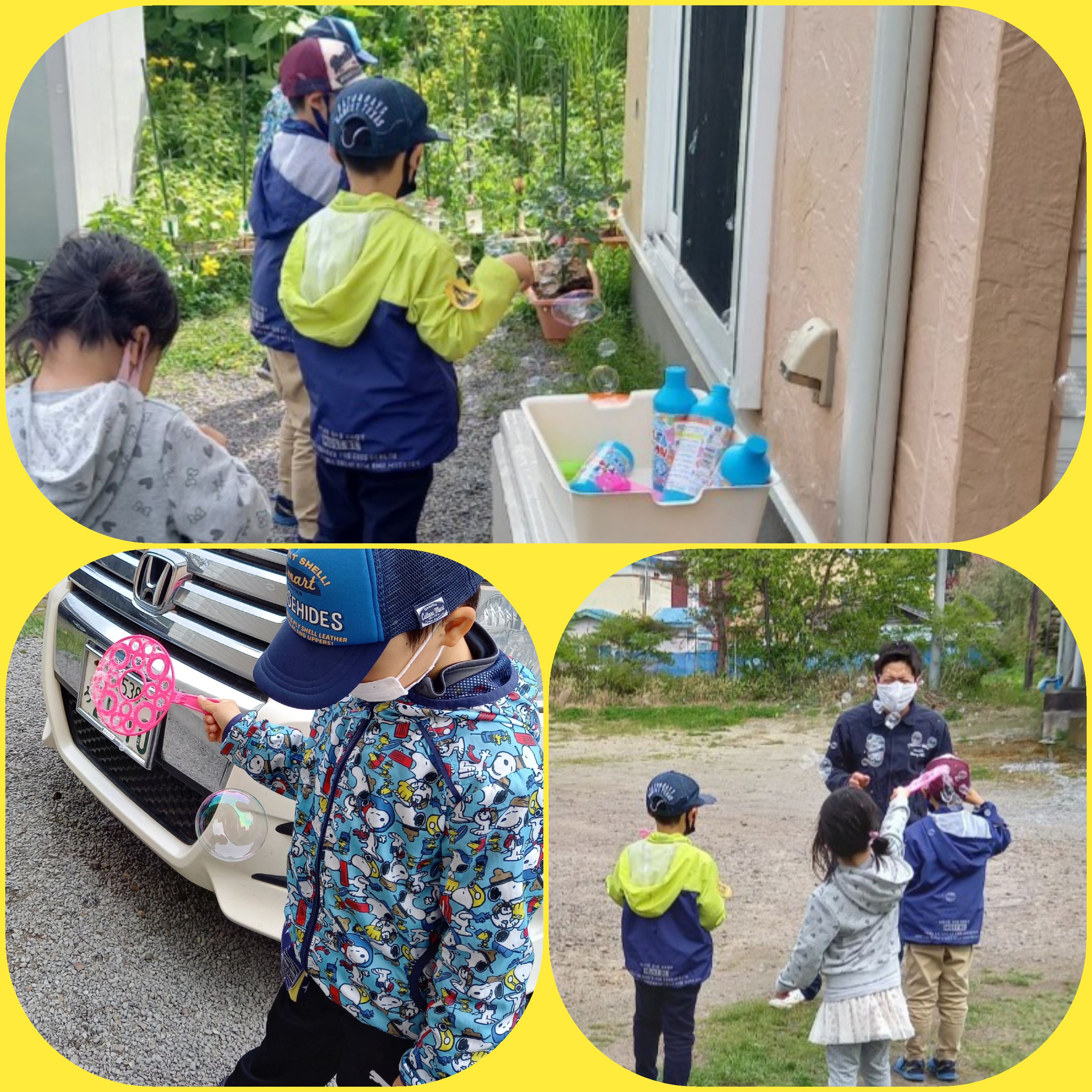 放デイの子供達は学習後あおぞら前でシャボン玉!