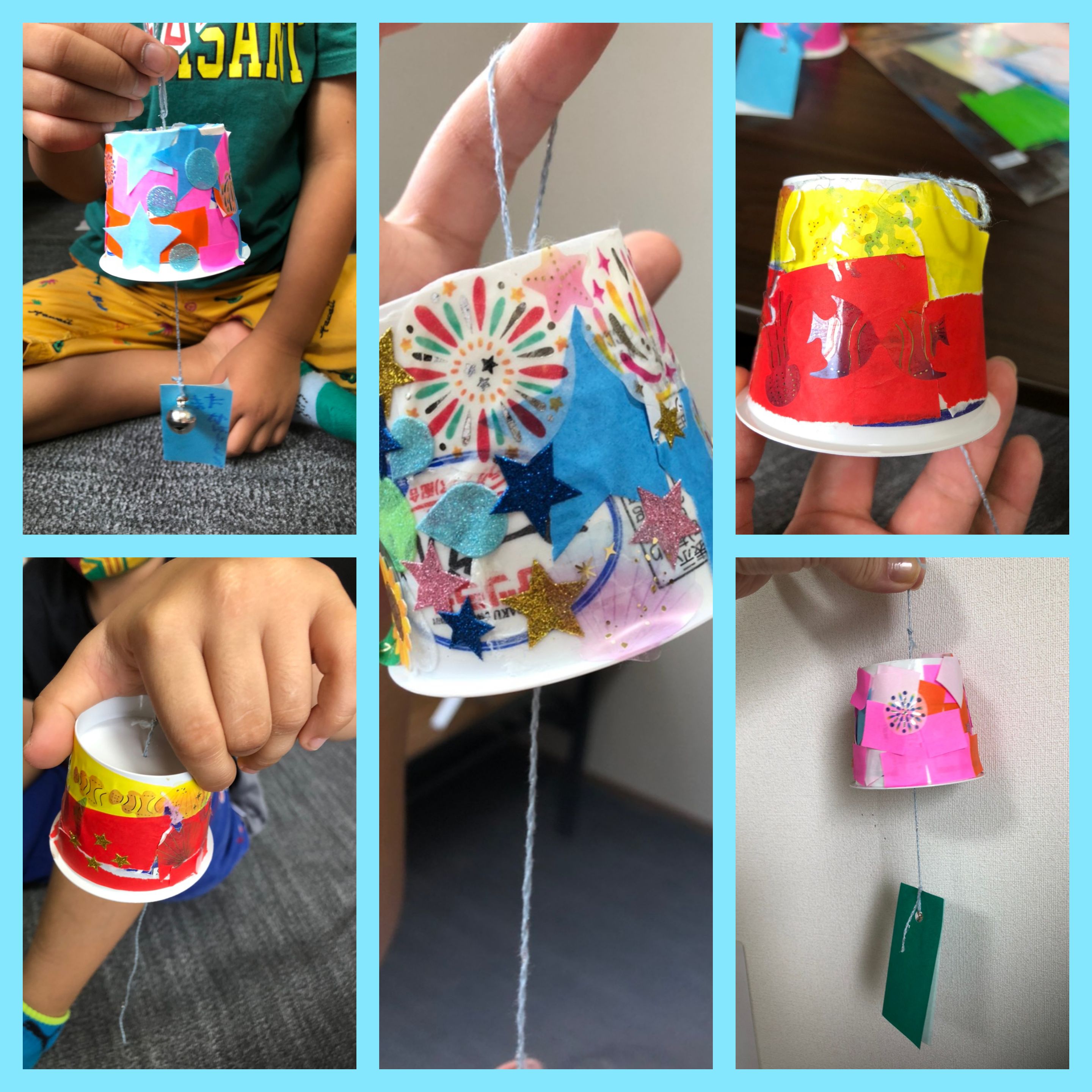 ヨーグルトの空いた容器を再利用して折り紙やシールを貼り個性溢れるオリジナル風鈴の完成です!