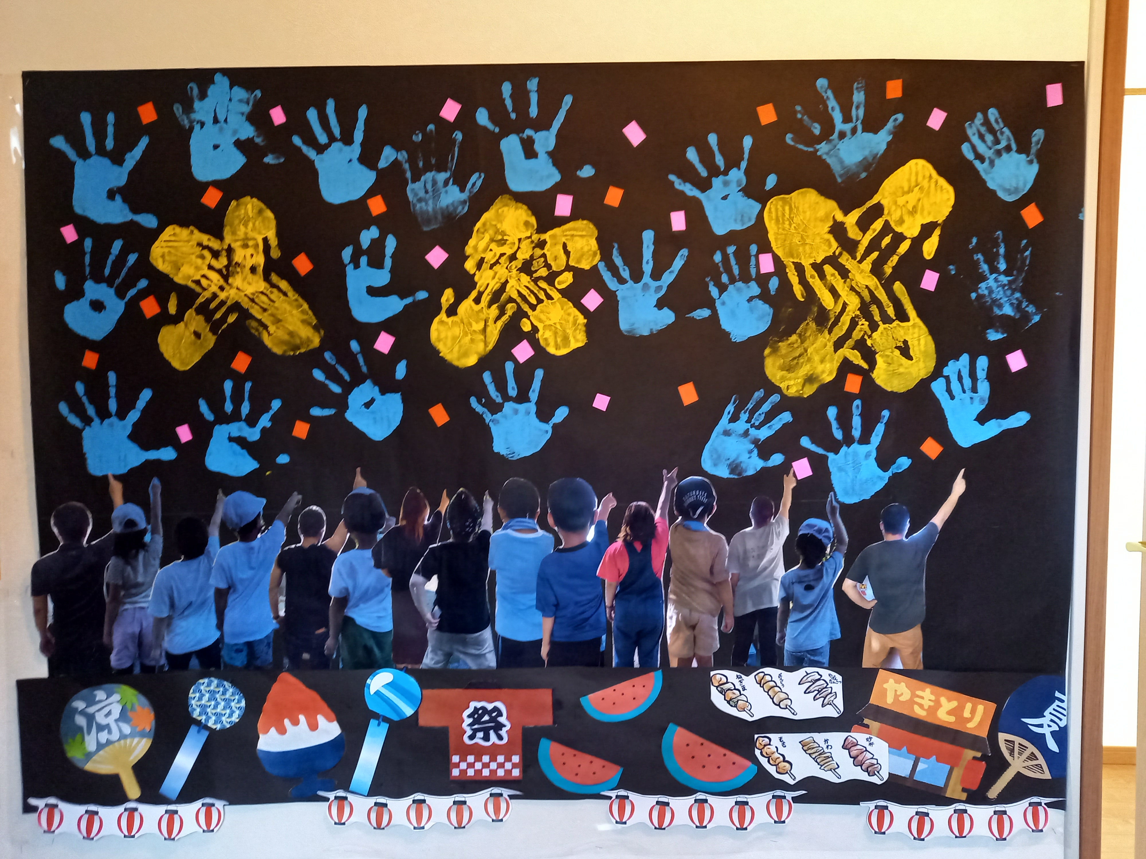 お祭りも花火大会も中止で行けませんが、あおぞらの壁面では、屋台も!花火も!少しでも夏祭りの気分を感じられる作品になりました!