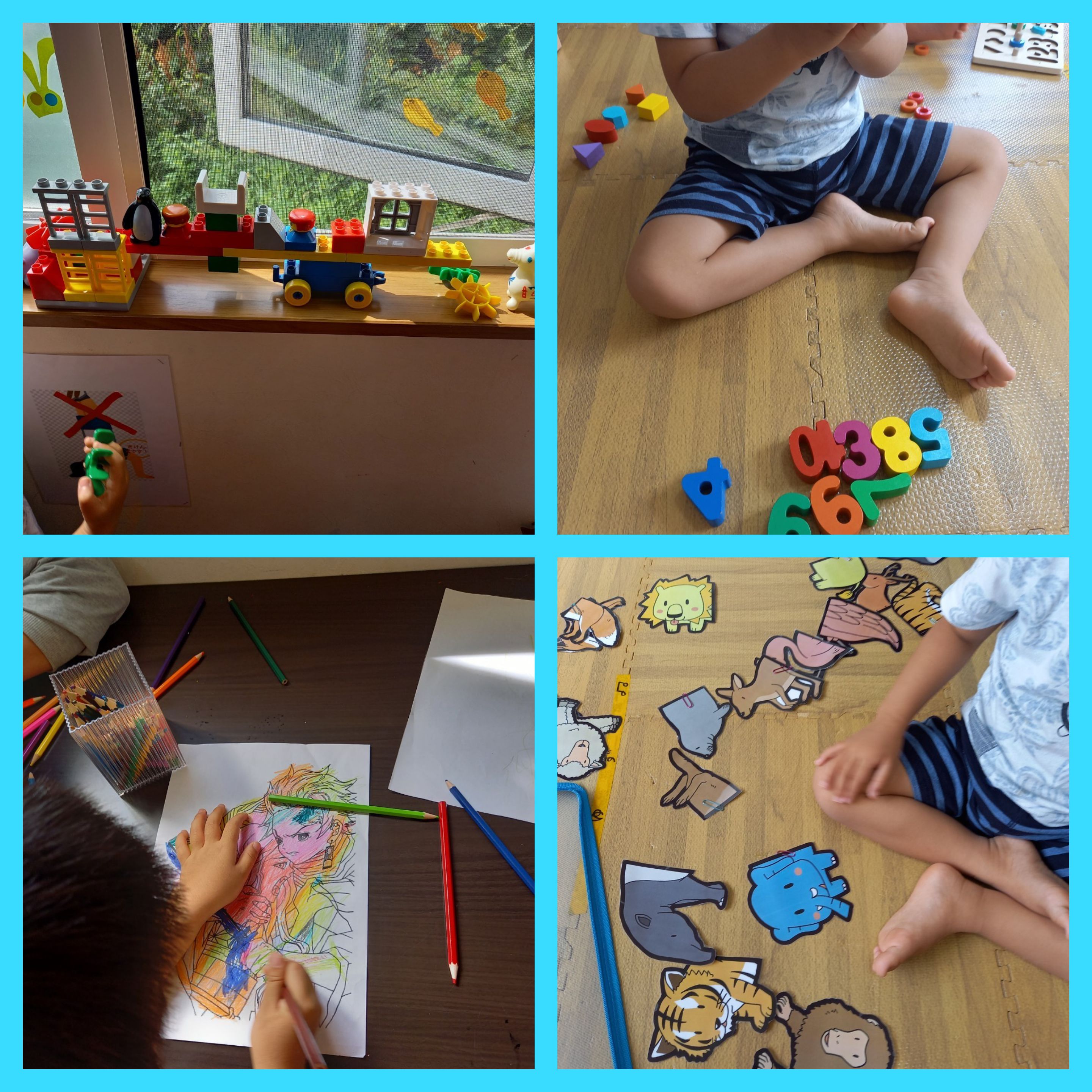 ブロックで貨物列車を作ったり、数字ブロックで形や色を楽しみながら覚える子。