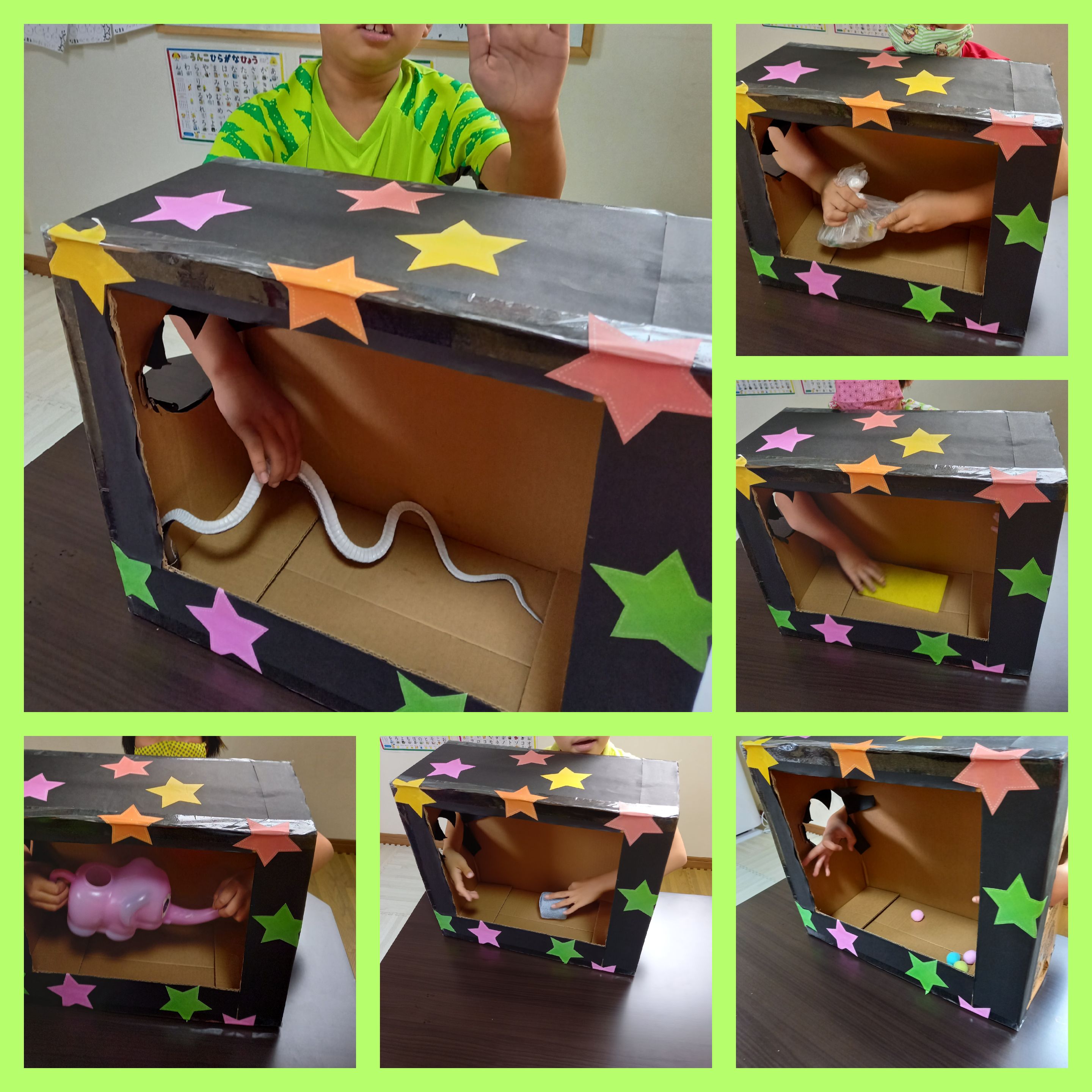 子供達が実践する前私達職員もトライしますが、何入ってるかわからない箱に手を入れるのはドキドキします(。・´д`・。)