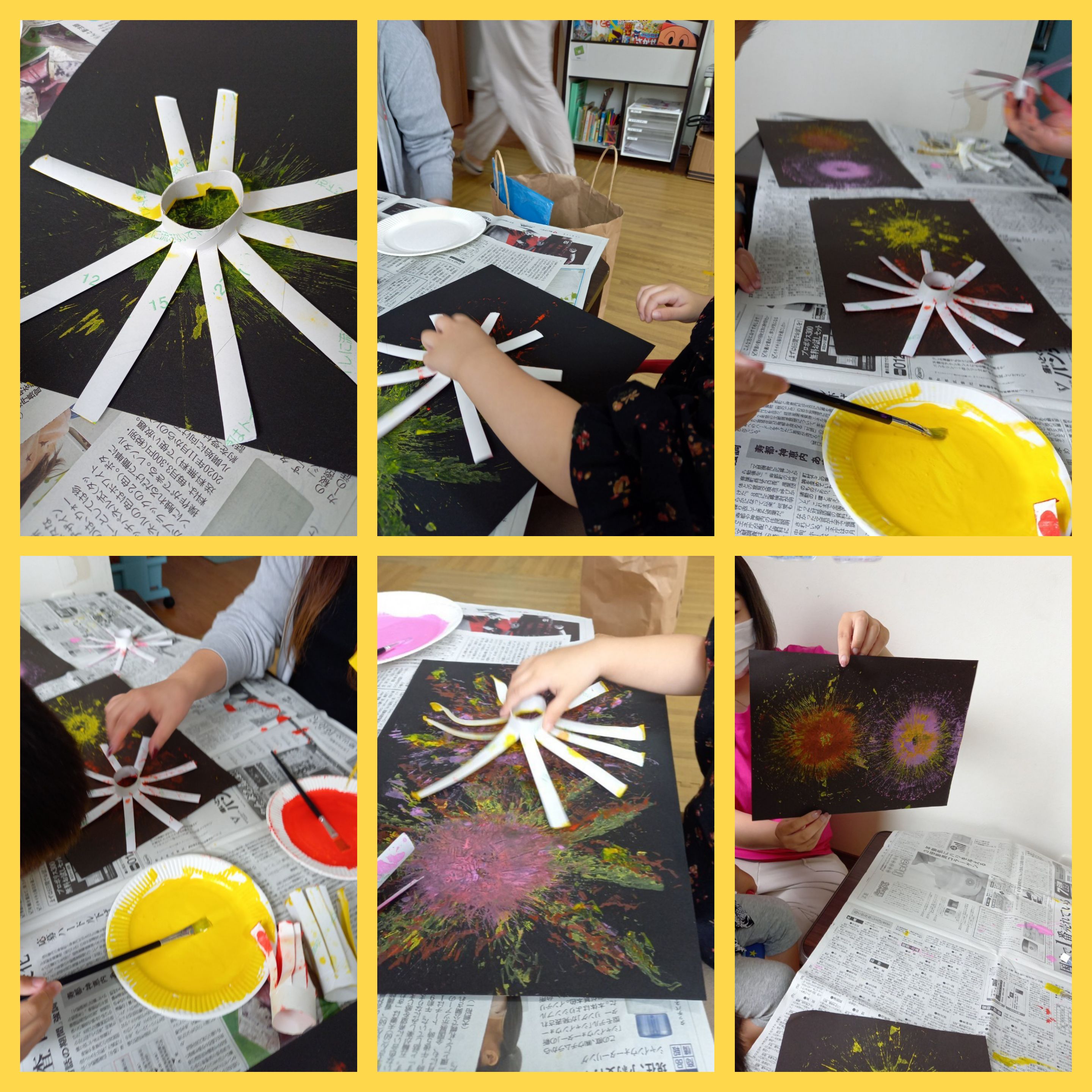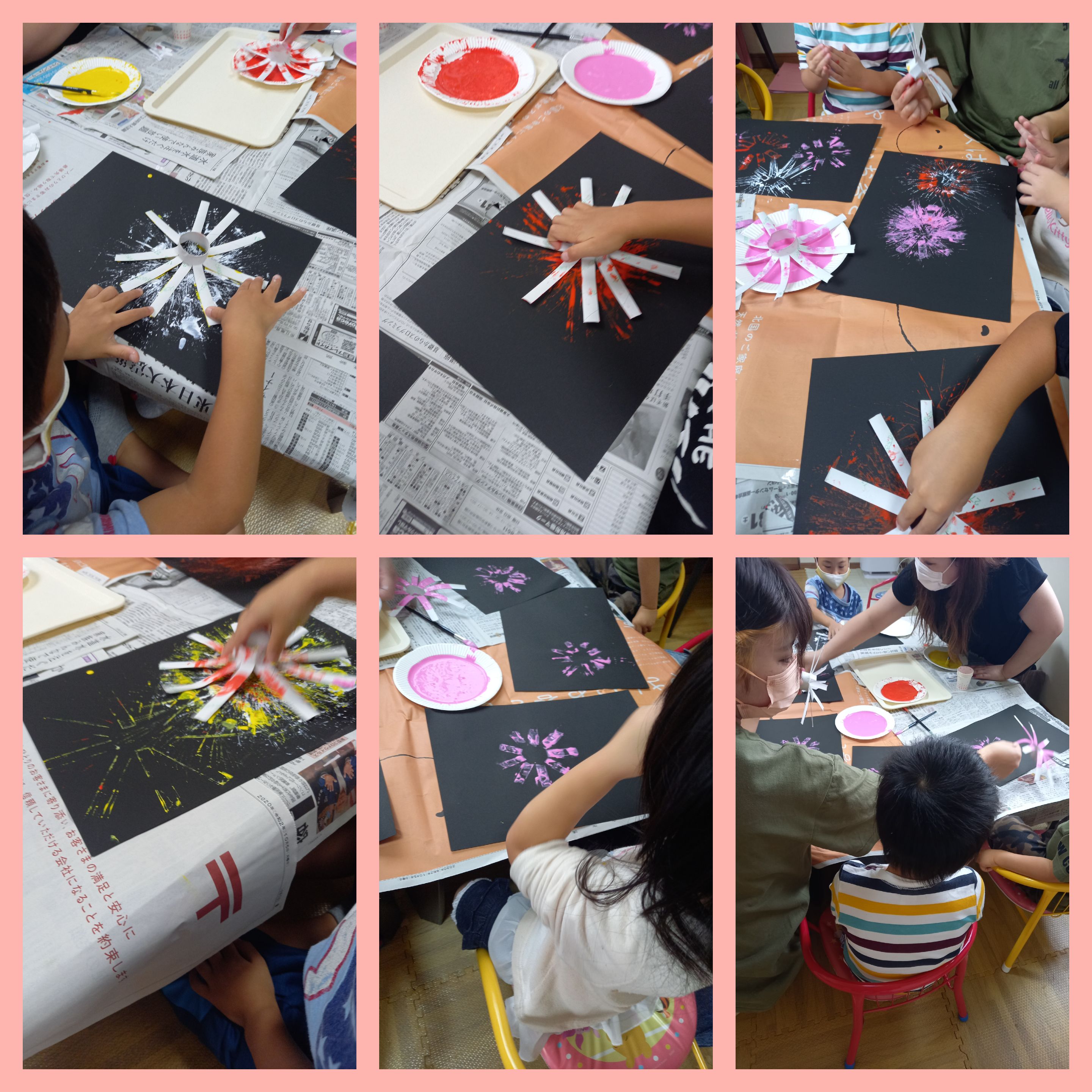 紙コップと絵の具を使い黒画用紙にポンポン♪