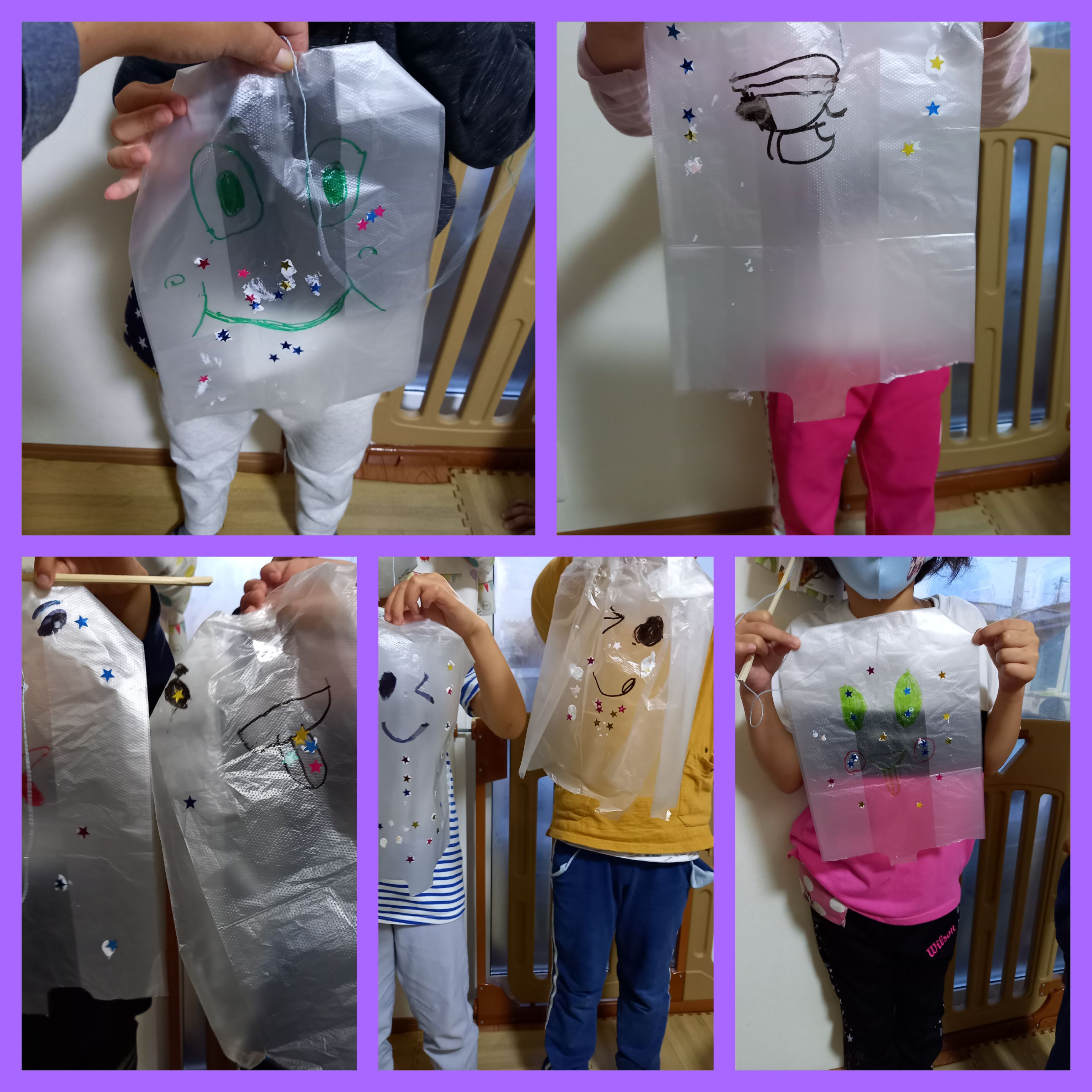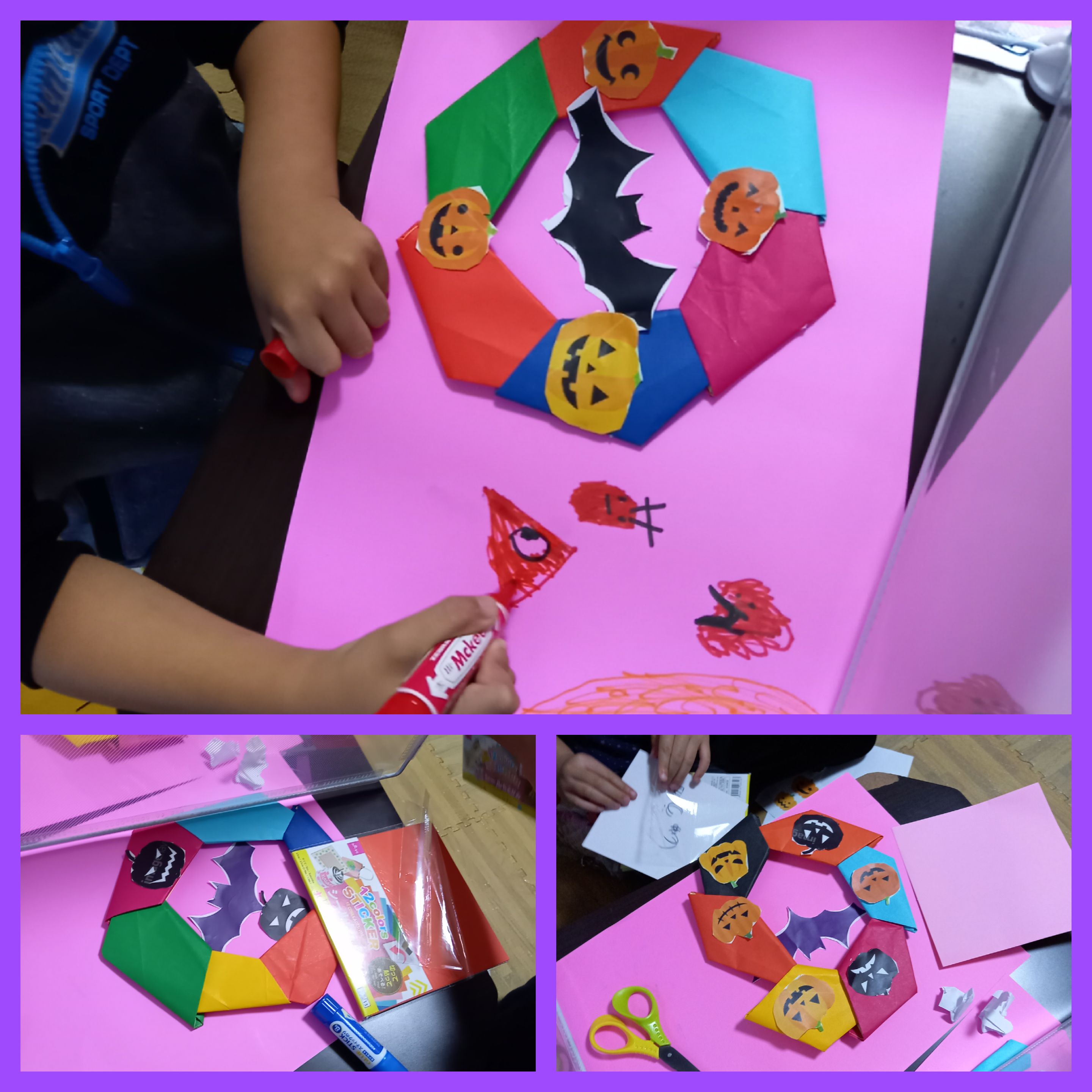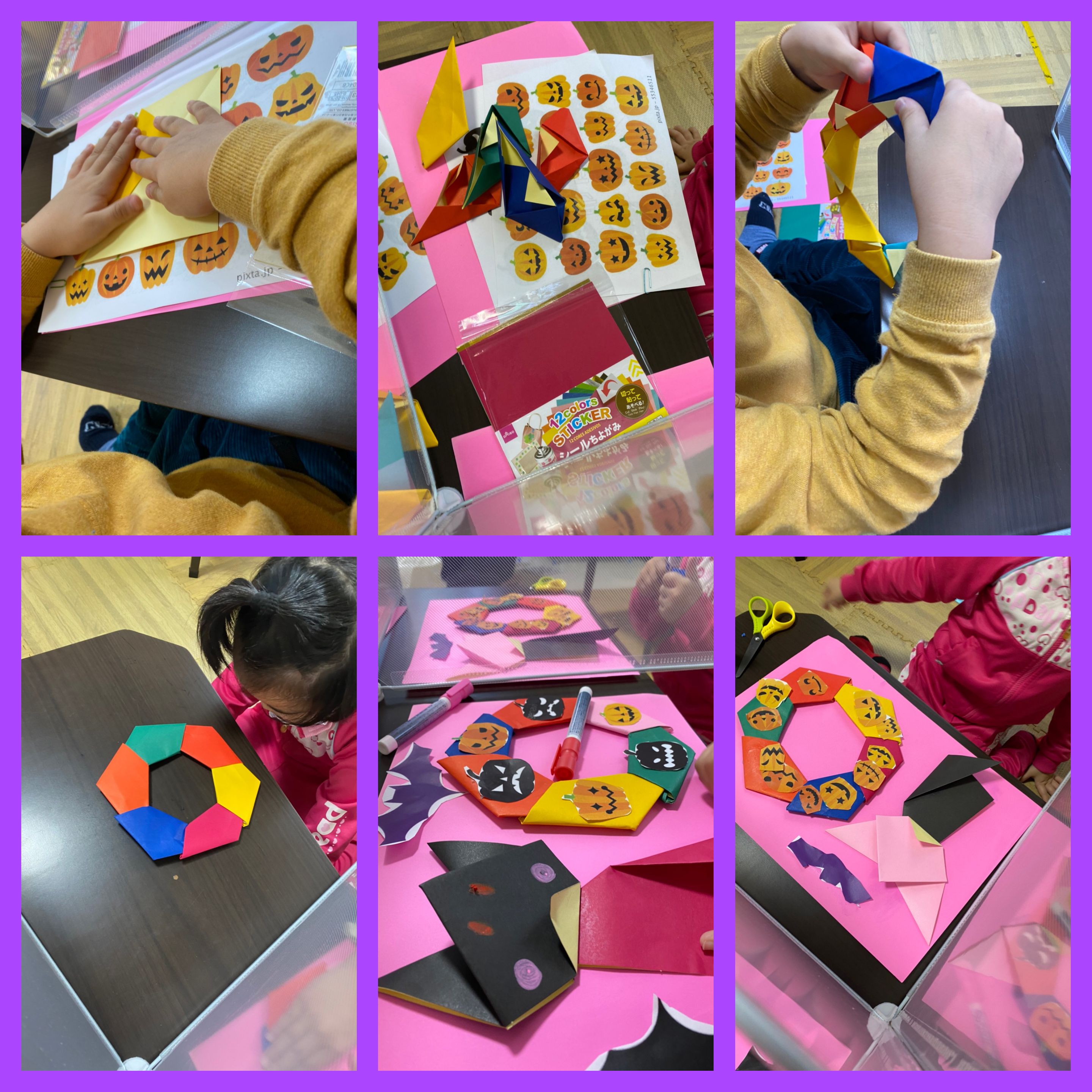 ユラユラお化けの他にも折り紙でリースを作り、画用紙に思い思いのお化けの絵を書いて今月の制作を楽しみましたよ(*´∀`)♪