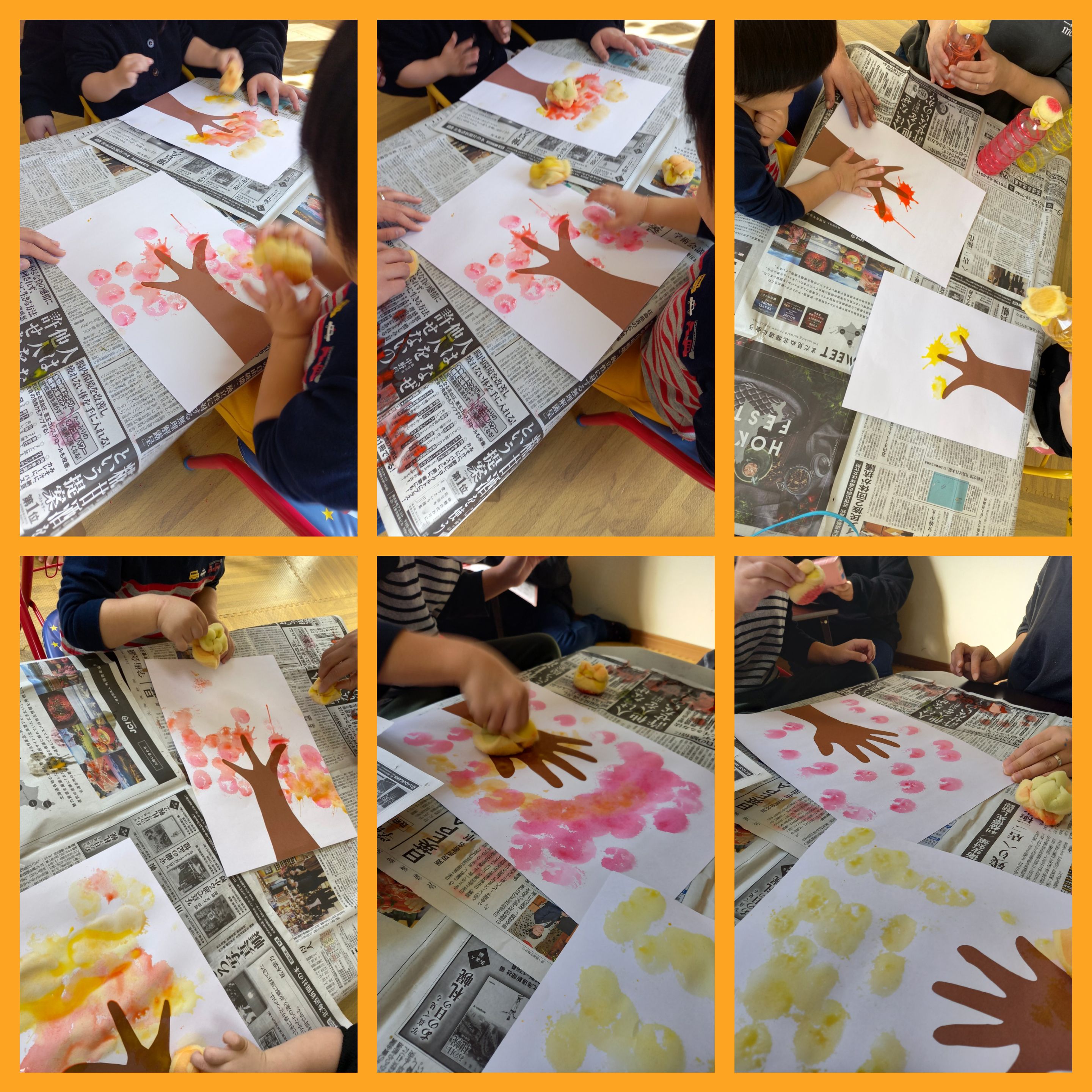 感触に敏感で手形を取るのが嫌いな子もいるので先生が木の幹を書いてくれました。