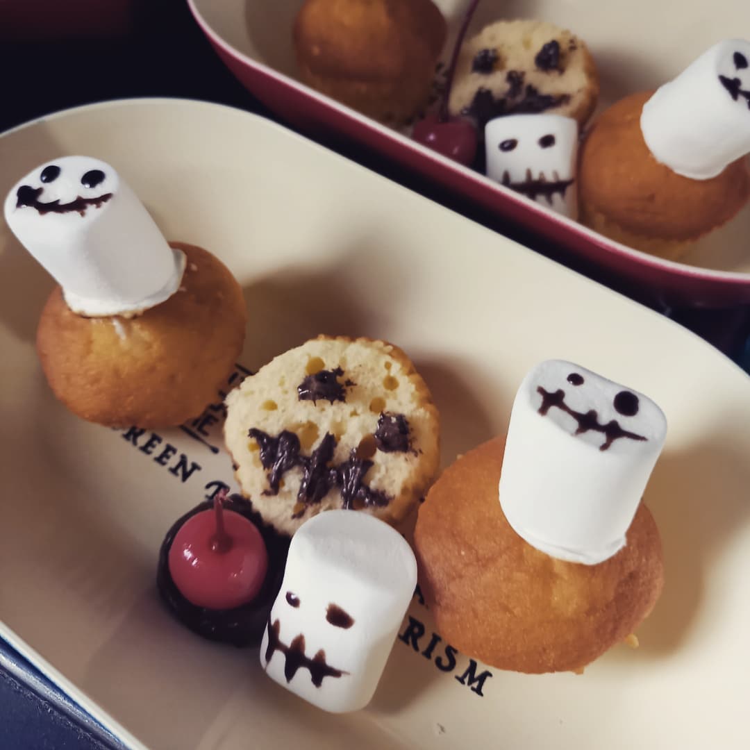 マシュマロにオバケの顔を描いてみました( *´艸`)