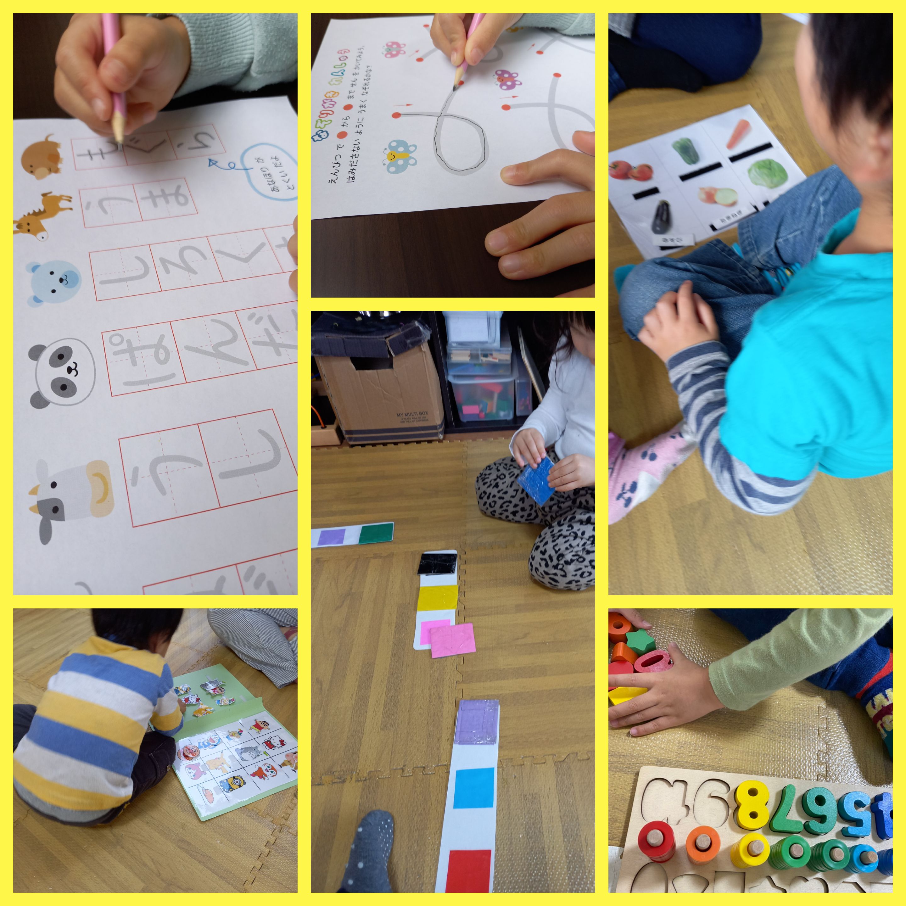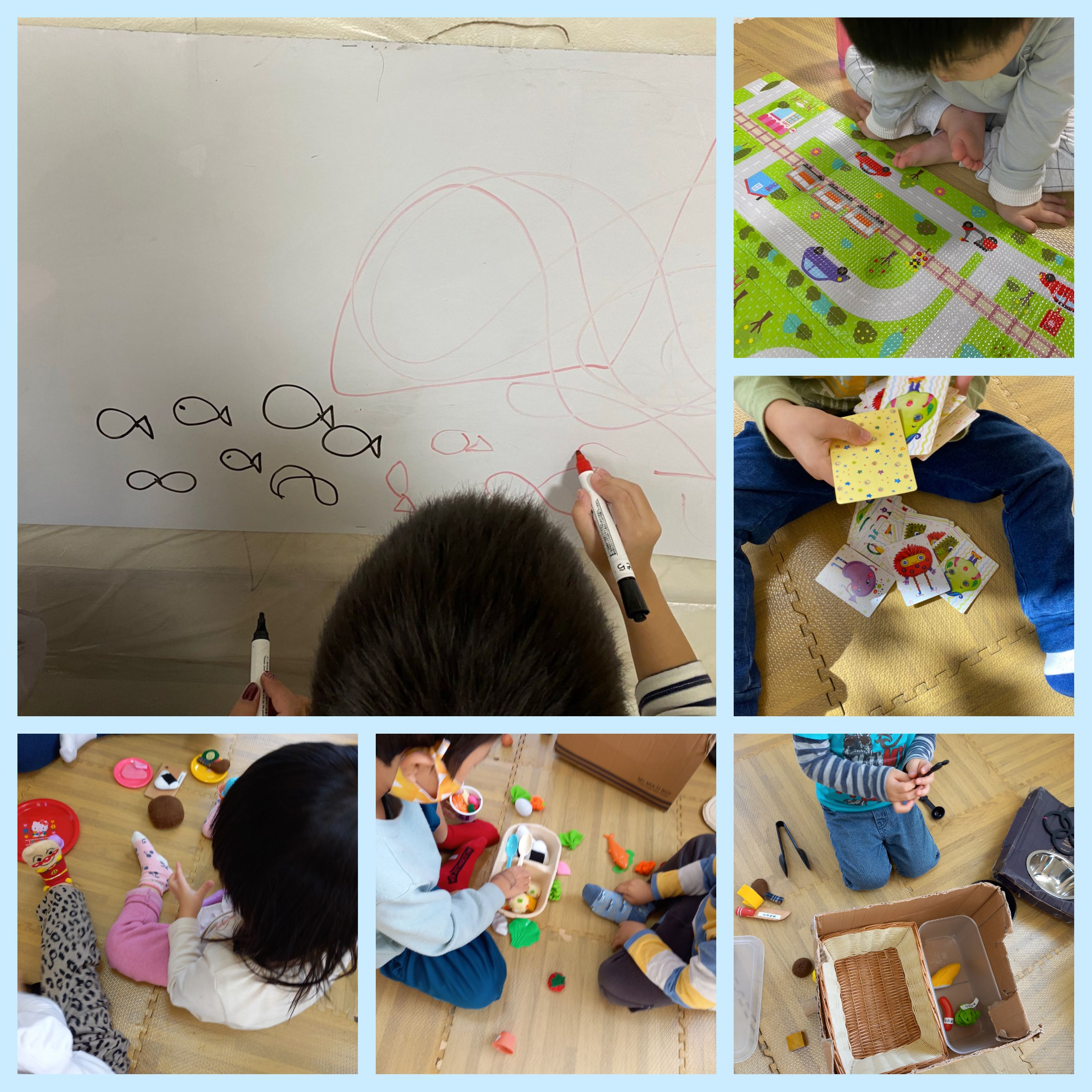 お絵描き、お店屋さん、カード遊び等思い思いに興味の向いたことに取り組み発想力、好奇心を育み、わからない事を沢山質問してくれ、遊びの中での発見や成長が沢山あります。