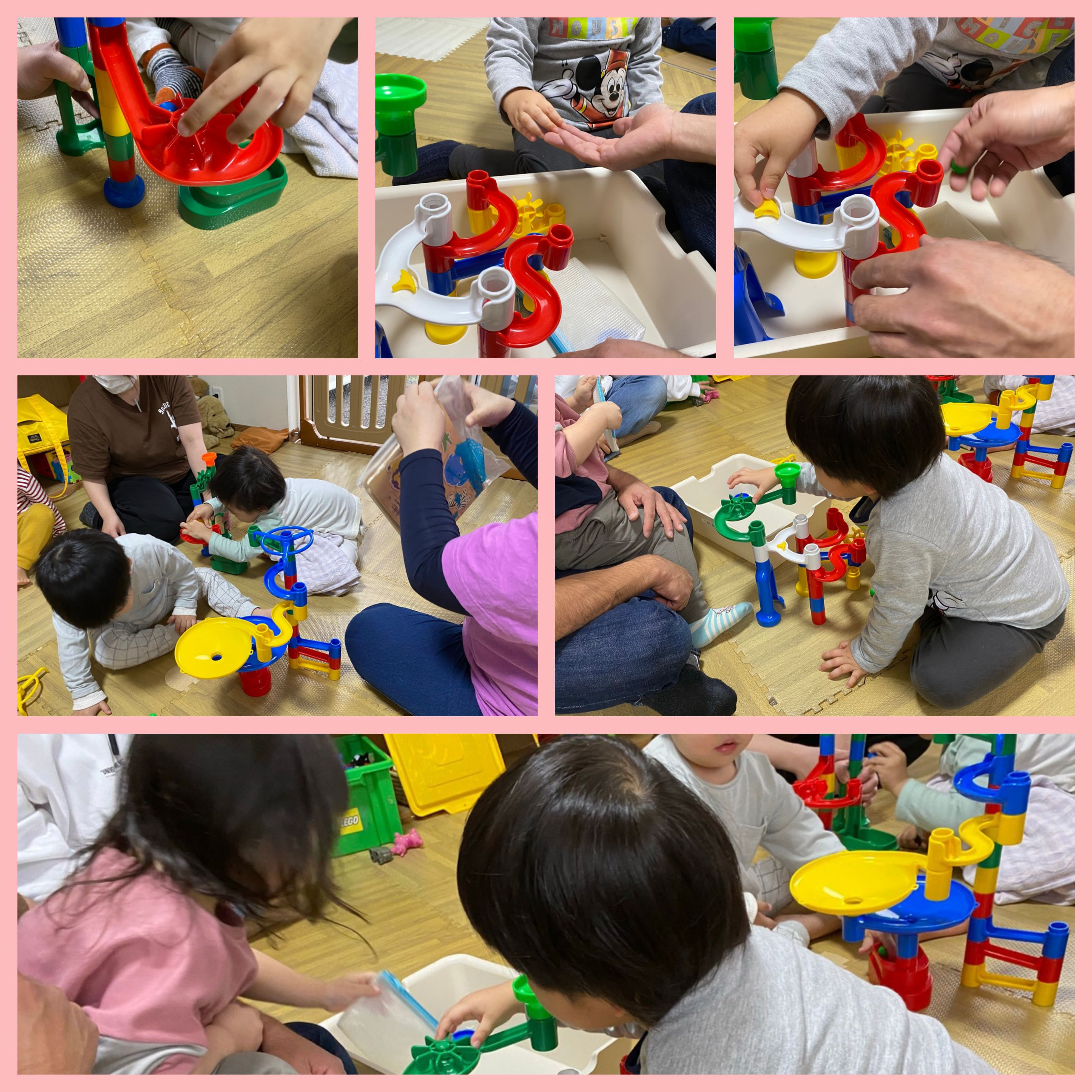 自分達で組み立ててはやり直しを繰り返し完成したルートにミニボールを転がし夢中になって楽しんでました。