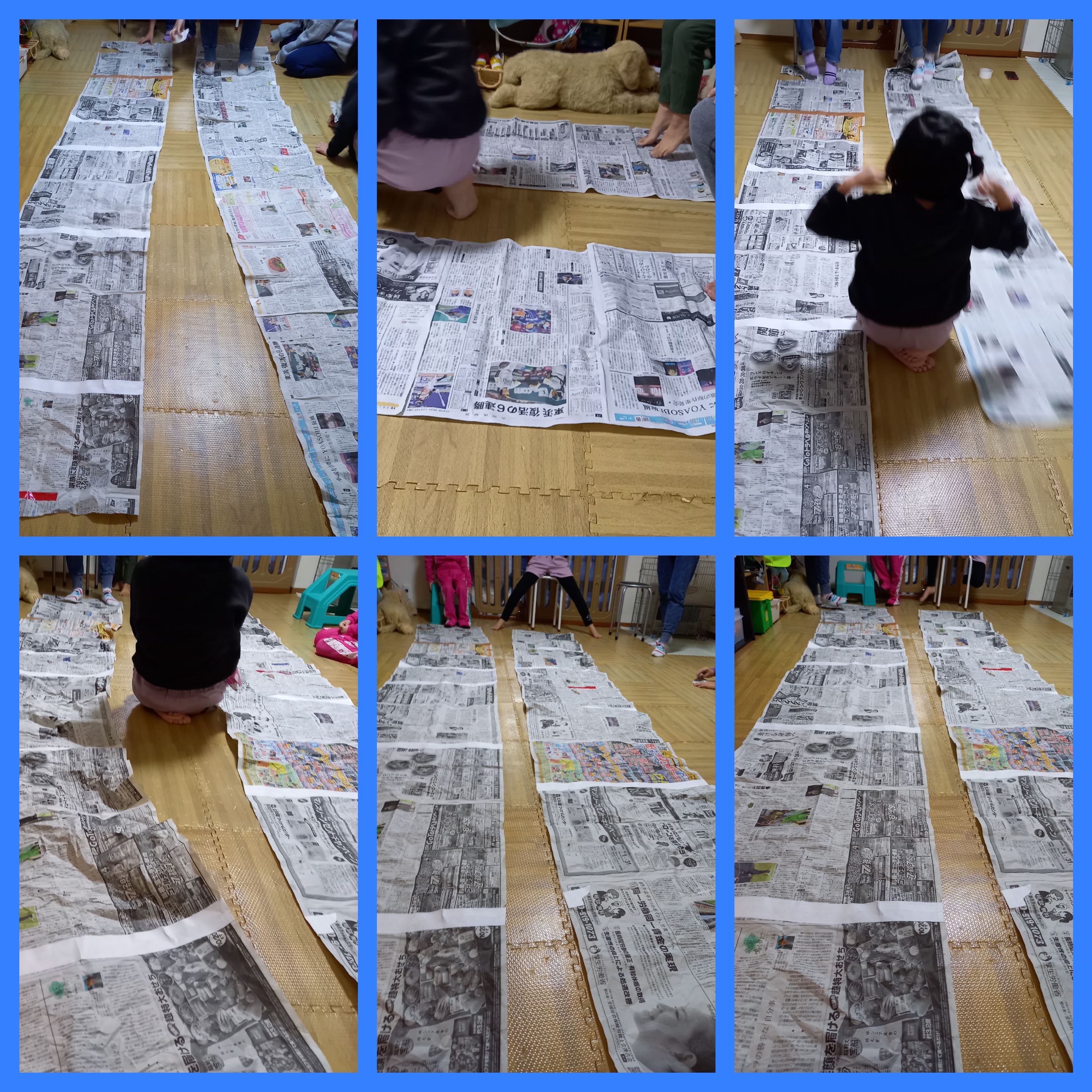なが~い新聞紙を、つま先でグングン早く巻くタイムレース!