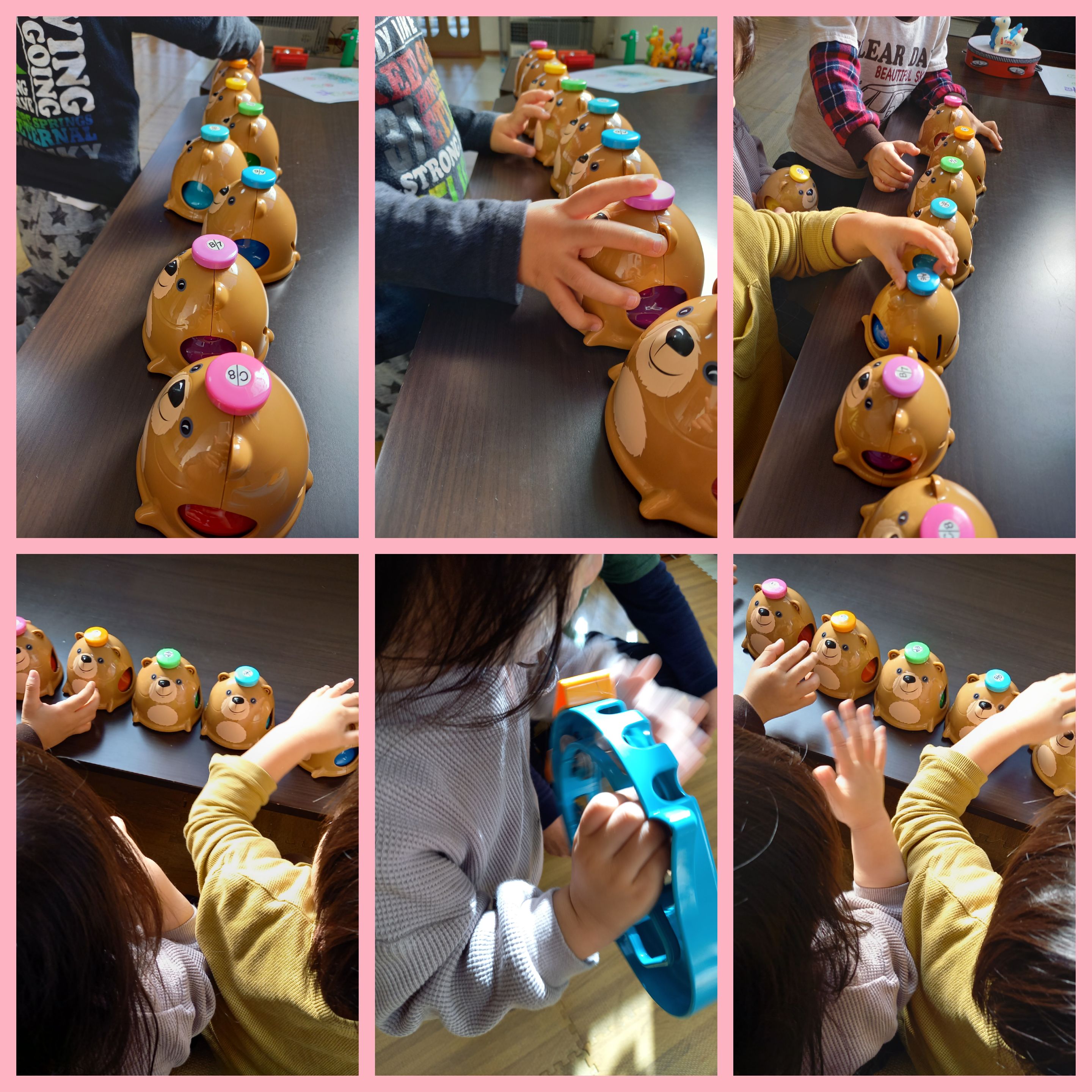 ニコニコ楽しんでクマさんの頭をポン!ポン!
