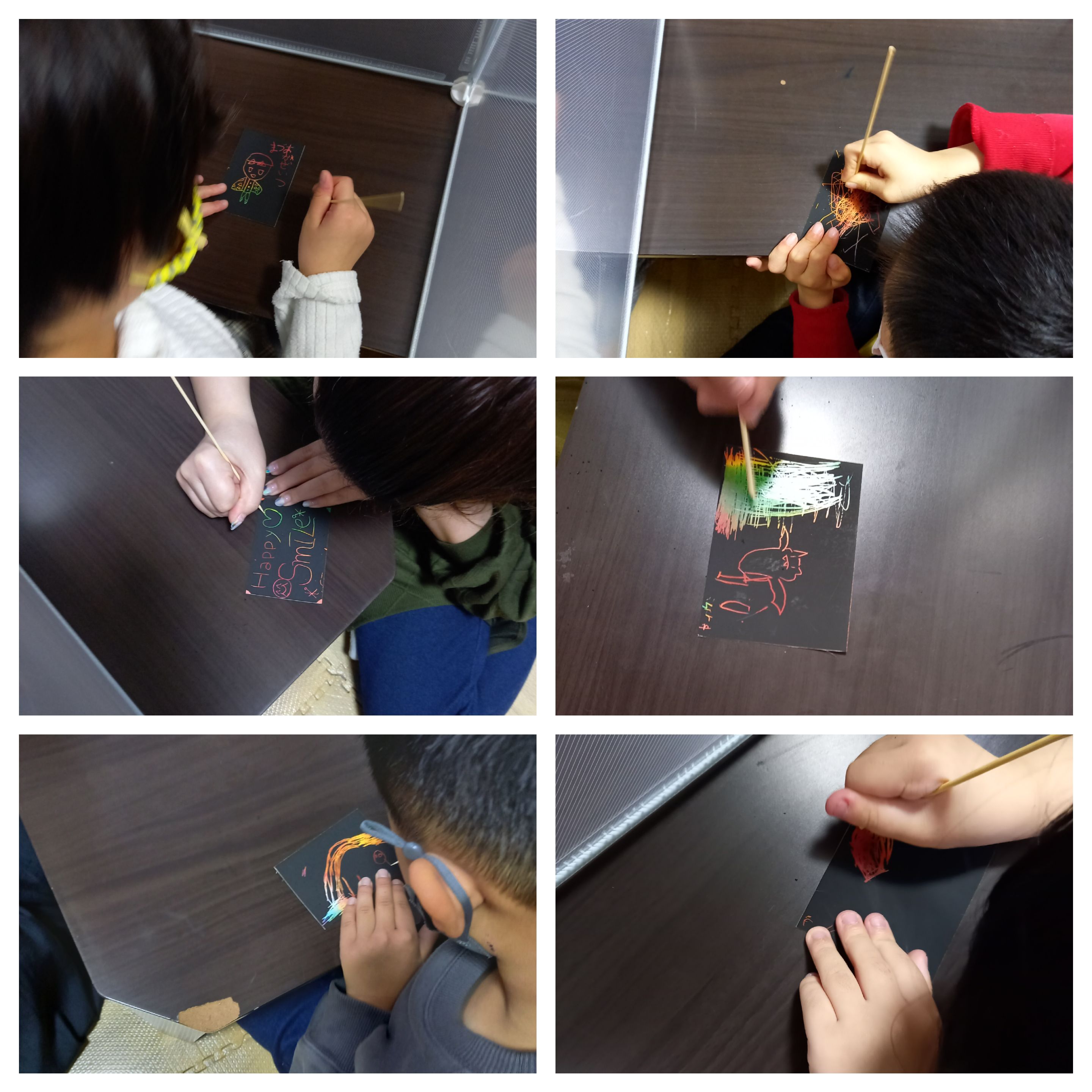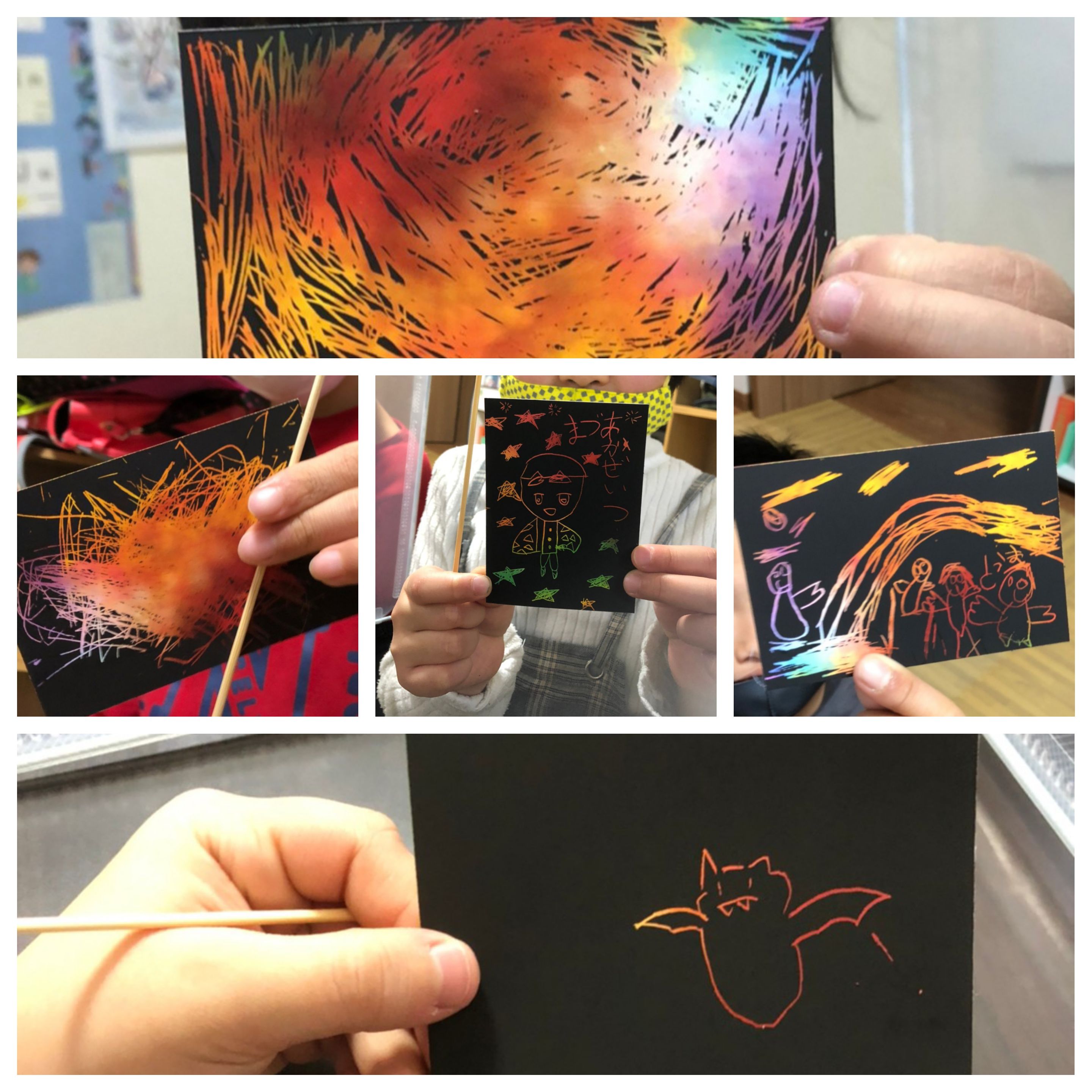 色について学んだ後、真っ黒なスクラッチの上から竹串で好きな絵を描きました!