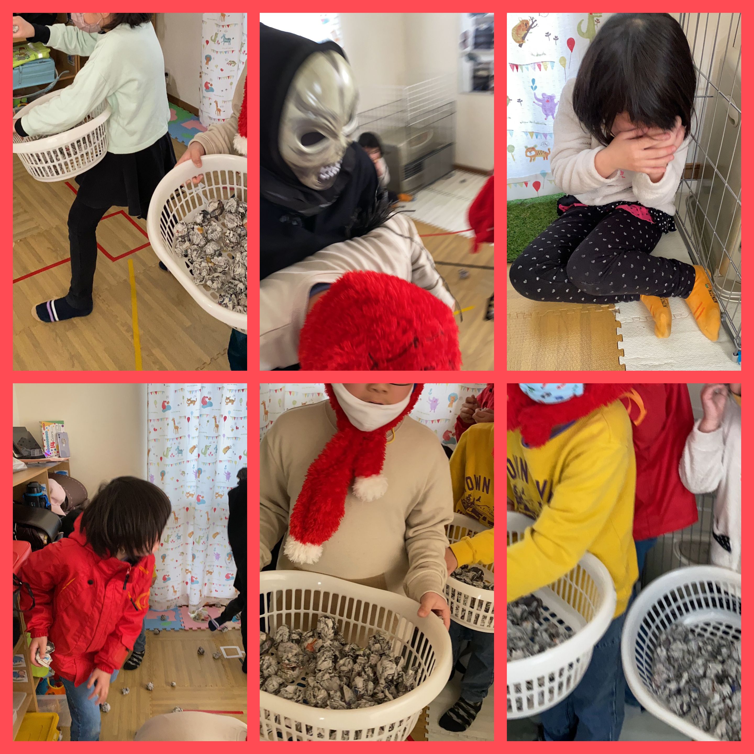 鬼の登場に新聞紙全力で投げる子。