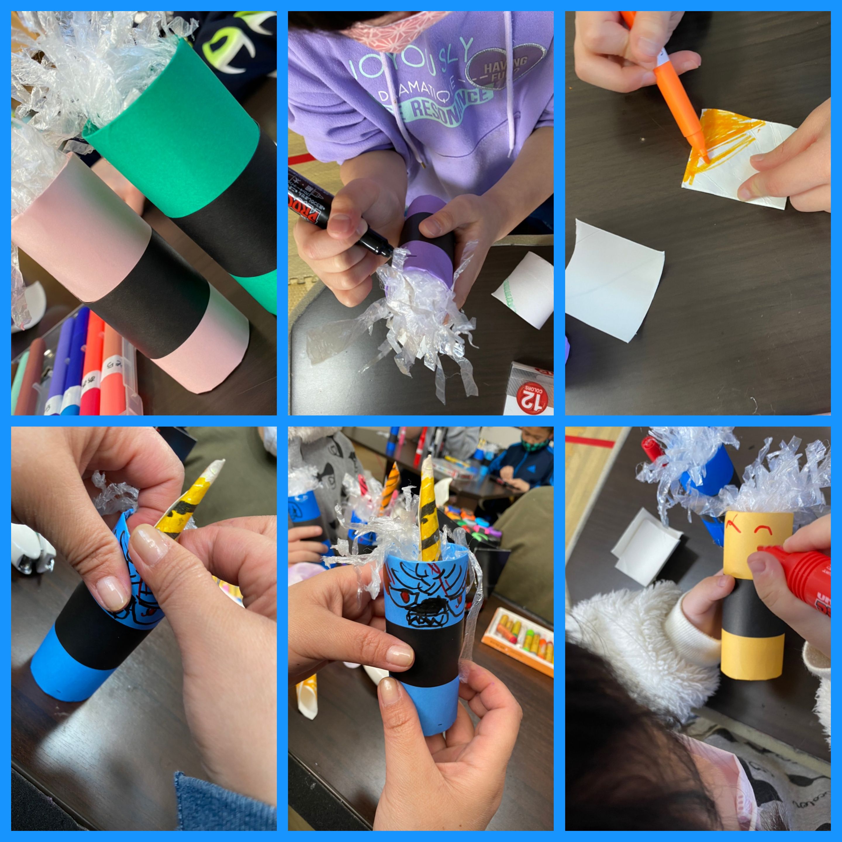 トイレットペーパーの芯に折り紙を巻いて、角もくるくる巻いて、それぞれのイメージで作成しました!