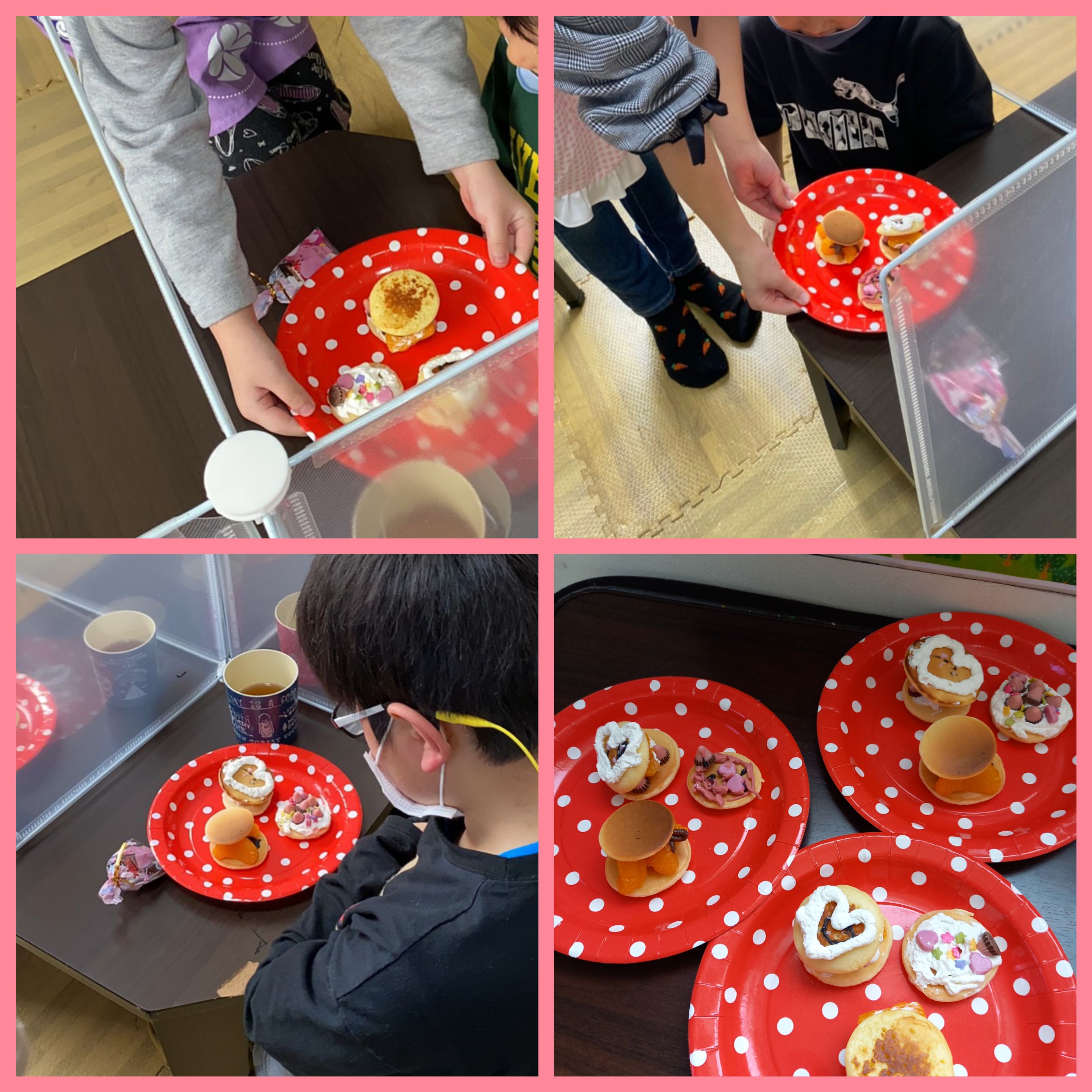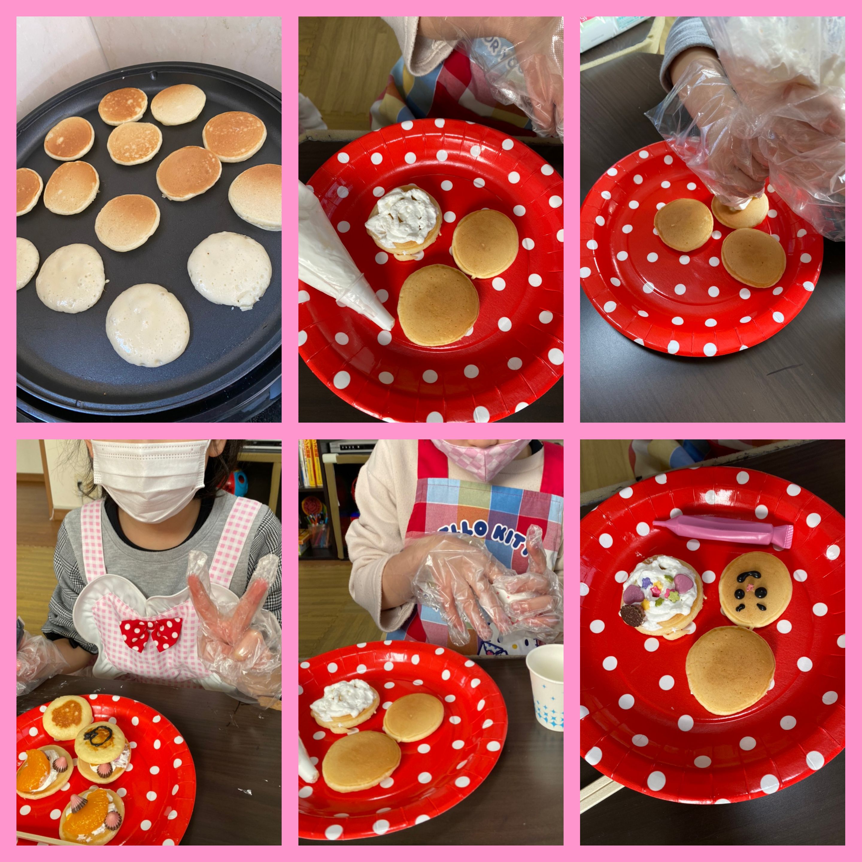 お昼に先生はミニホットケーキを黙々と焼き続け学習終わり女の子チームで男の子にホットケーキのトッピングをしました!
