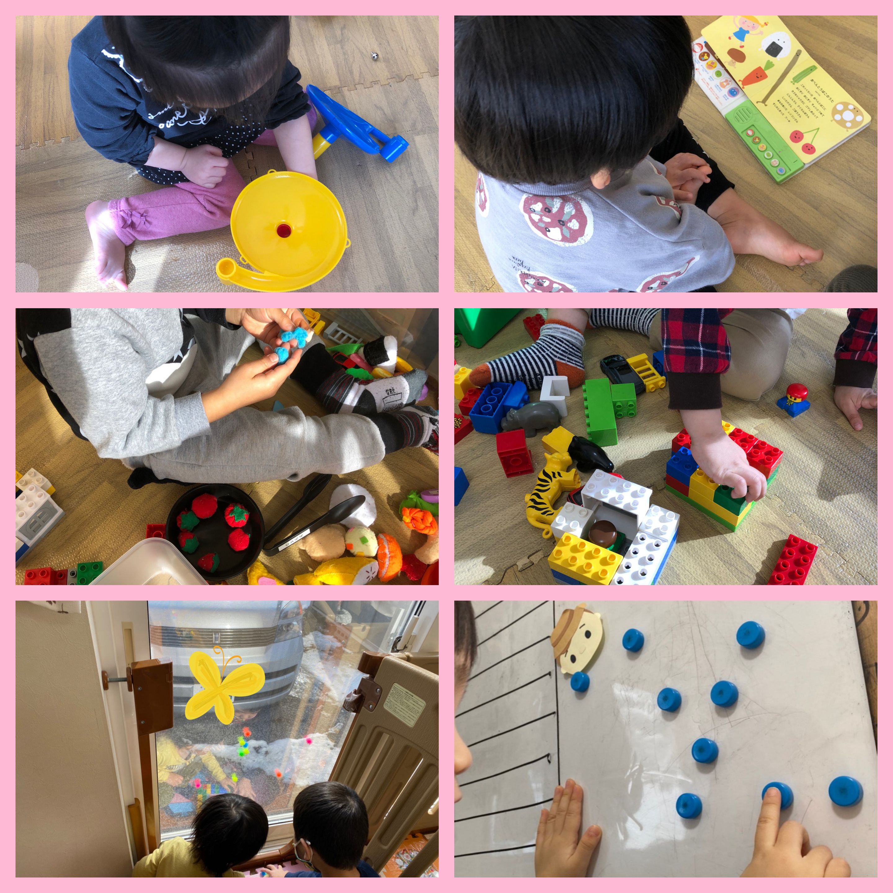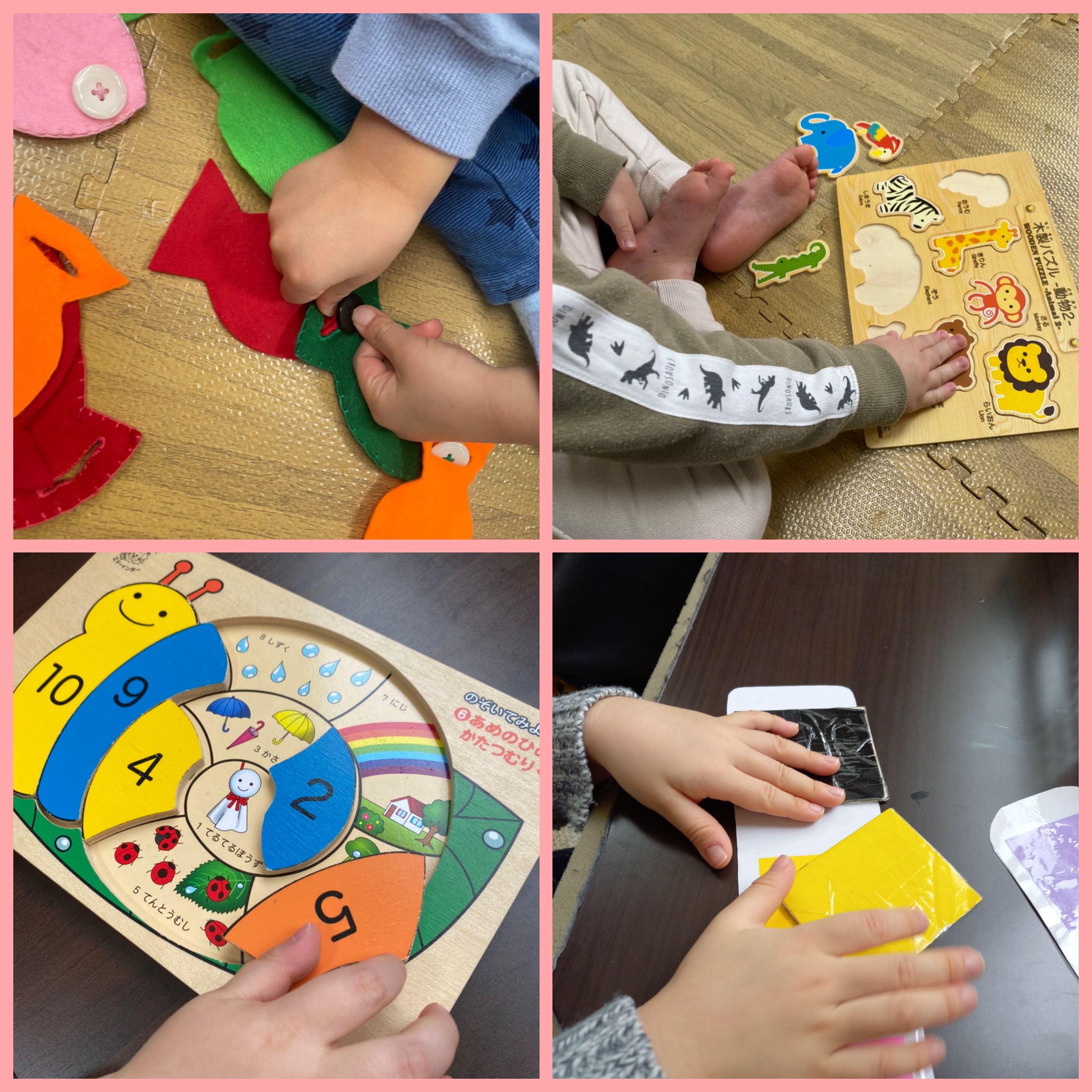 指先強化や色マッチング、数字や動物の型はめ等、個々に興味のあるものを取り入れ楽しみながら指先の力、色認識+発語に繋がるよう取り組んでます。