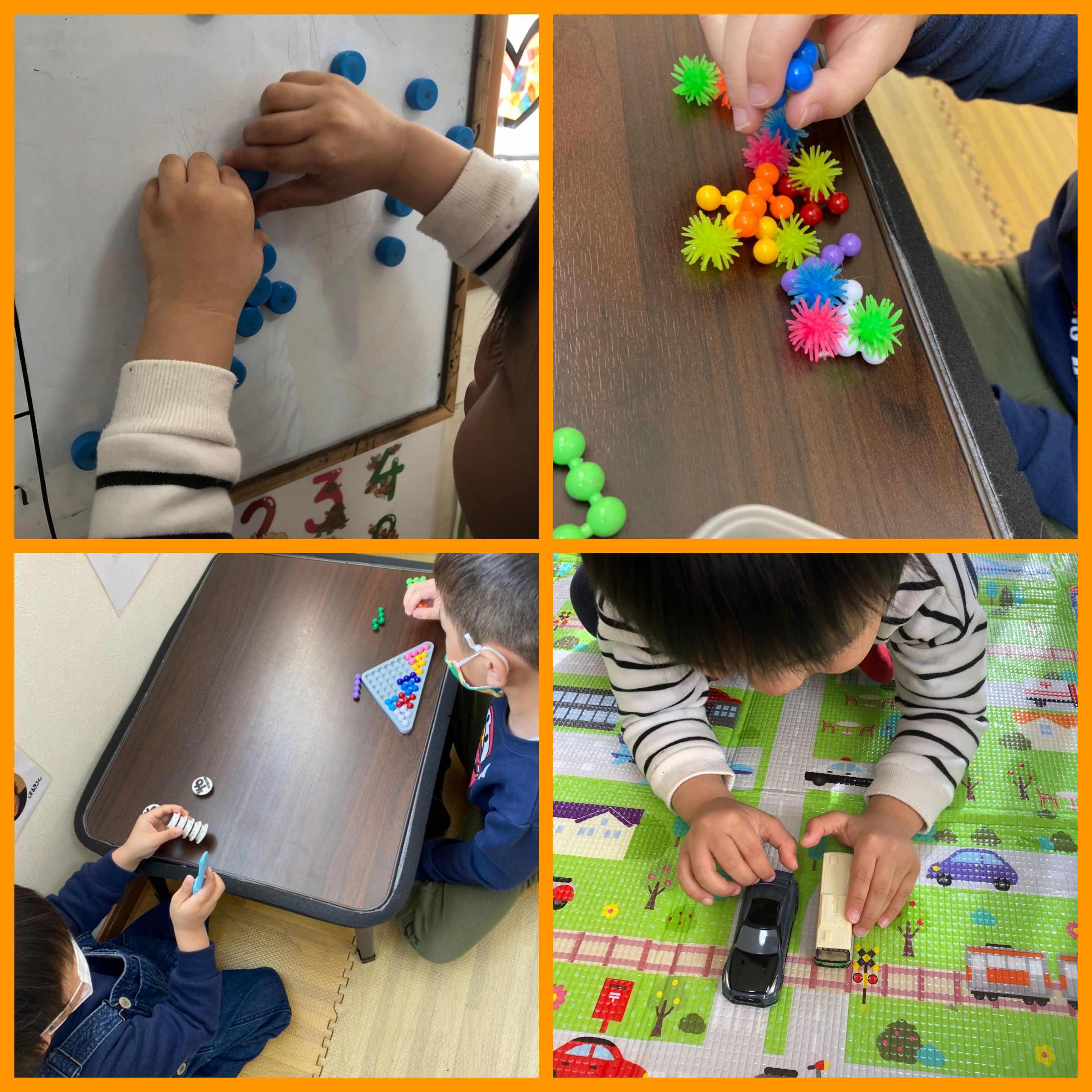 指先、両手で感触の違いを感じたり、色や形など視覚からの情報を取り入れ楽しみながら五感の発達、想像力、発想力が育まれてます。