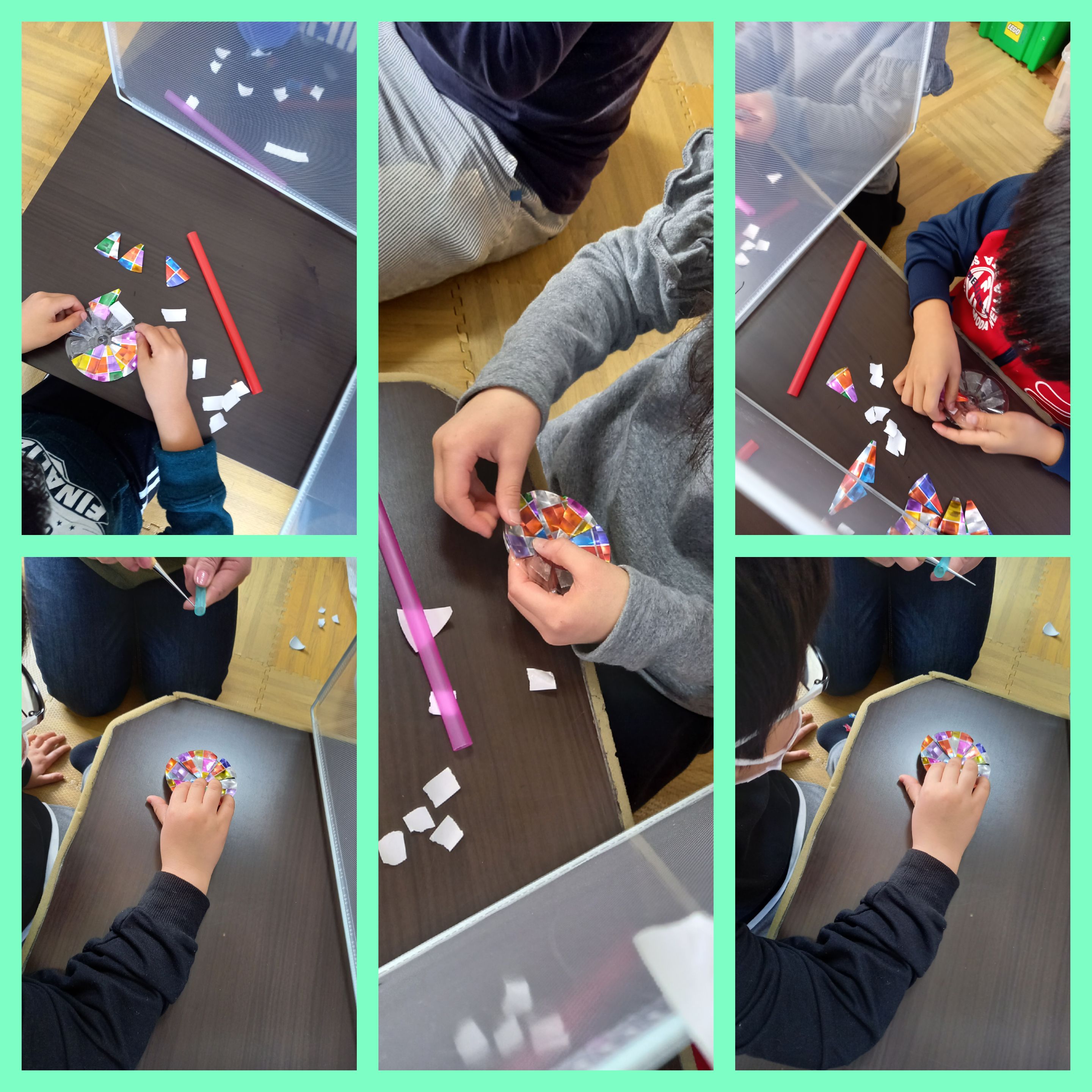 ペットボトルの底を使用しキラキラの折り紙をペタペタ張り、どんな形になるのかなぁー?!