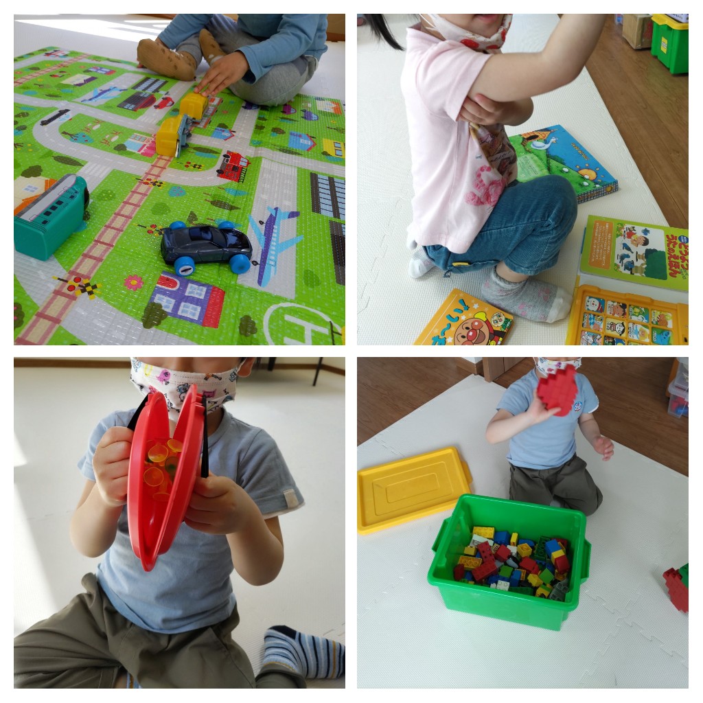 個人活動時間は、音楽の流れる絵本を開いてノリノリで体を動かして楽しんだり、マットの線路に電車を走らせたり、ブロック遊びなど興味の持ったものに夢中になる時間です。