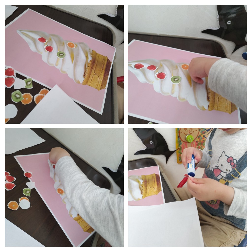 チョキチョキハサミにも挑戦し切ったフルーツをペタペタ。