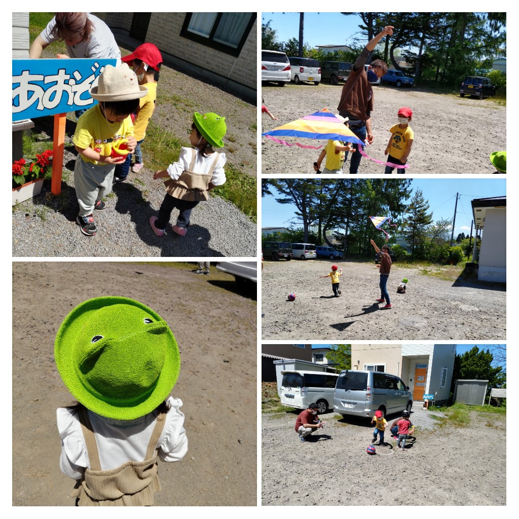 事業所前広場でサッカーや凧揚げに挑戦し楽しみました!