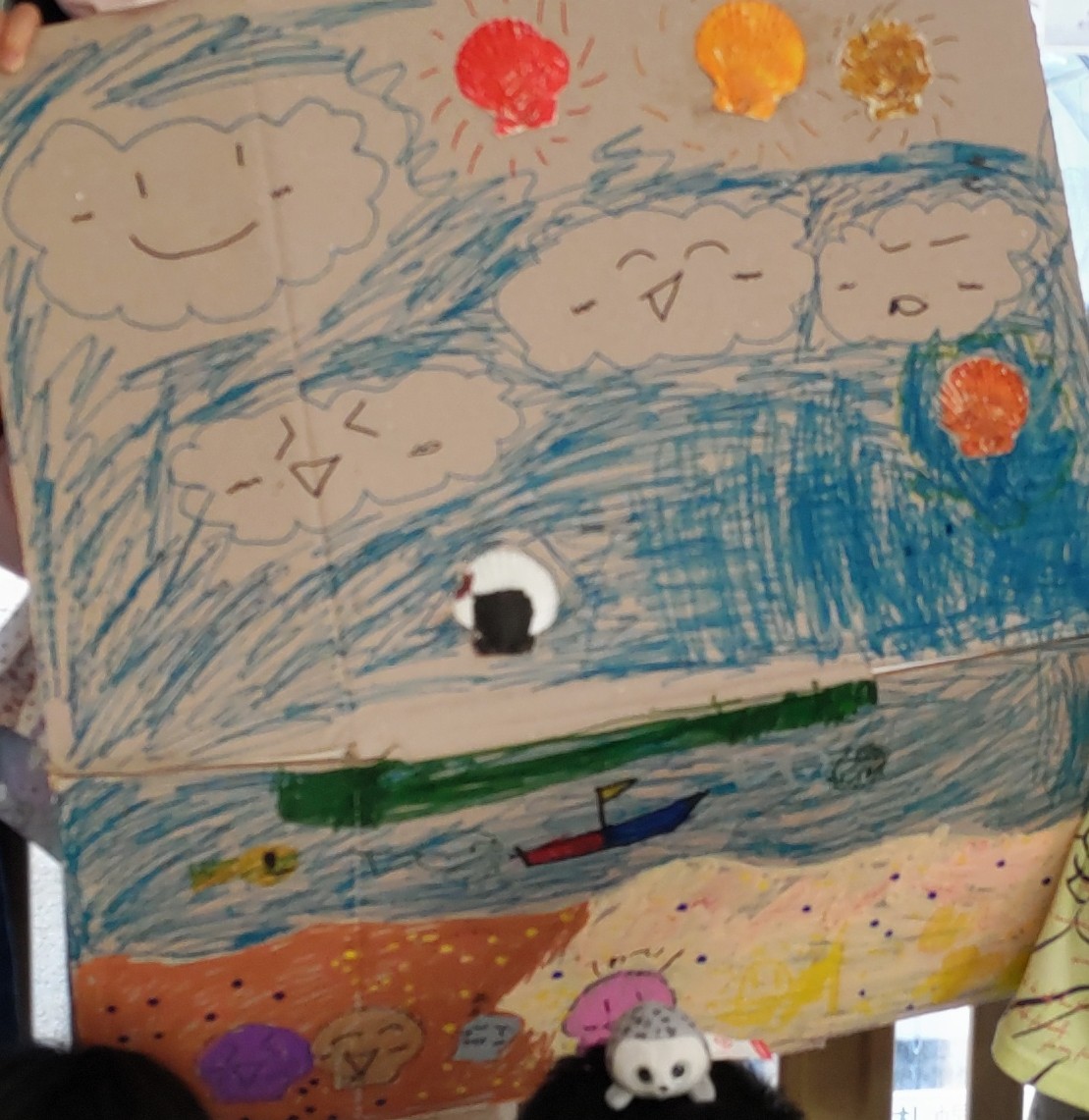 ホタテに色を塗ったり、ホタテの型を描いたり(^^)