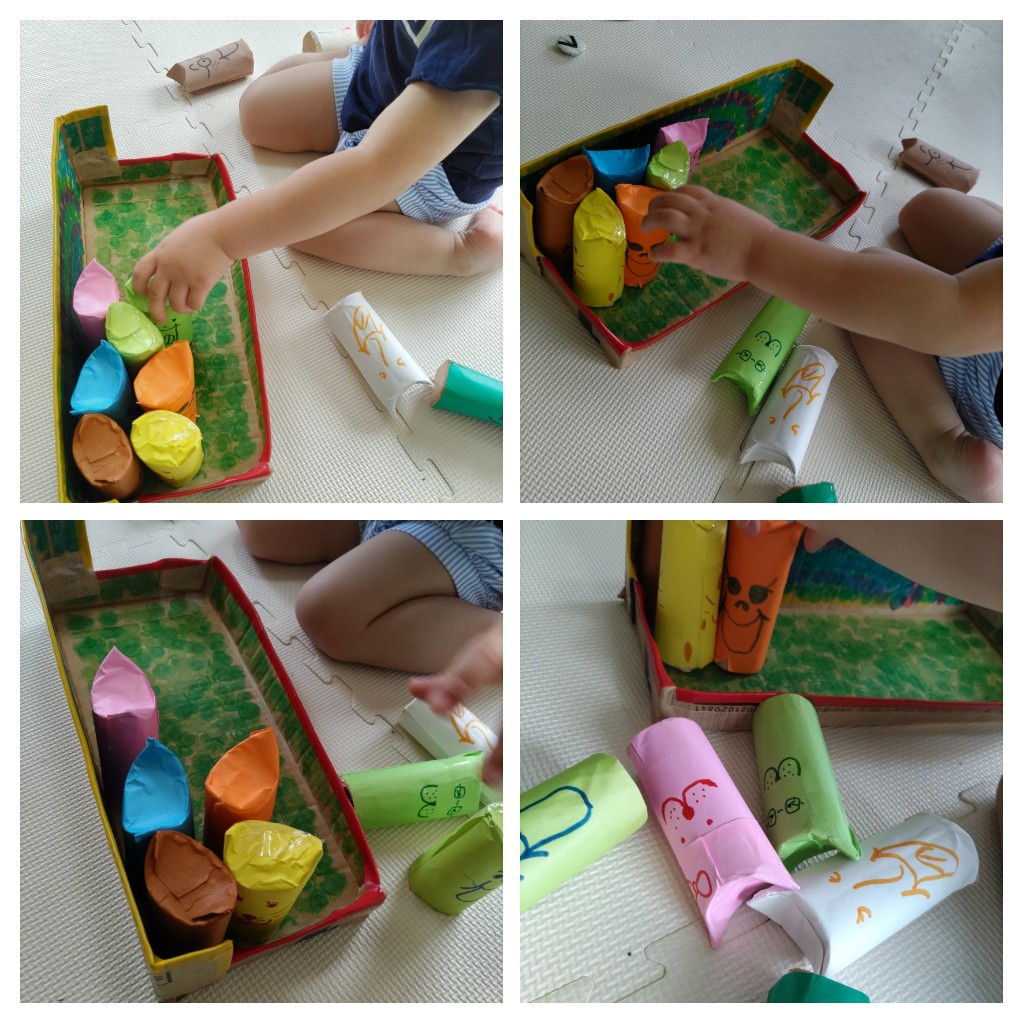 トイレットペーパーの芯を使い手作りした玩具をさり気なく置いてみたら発見してくれて、