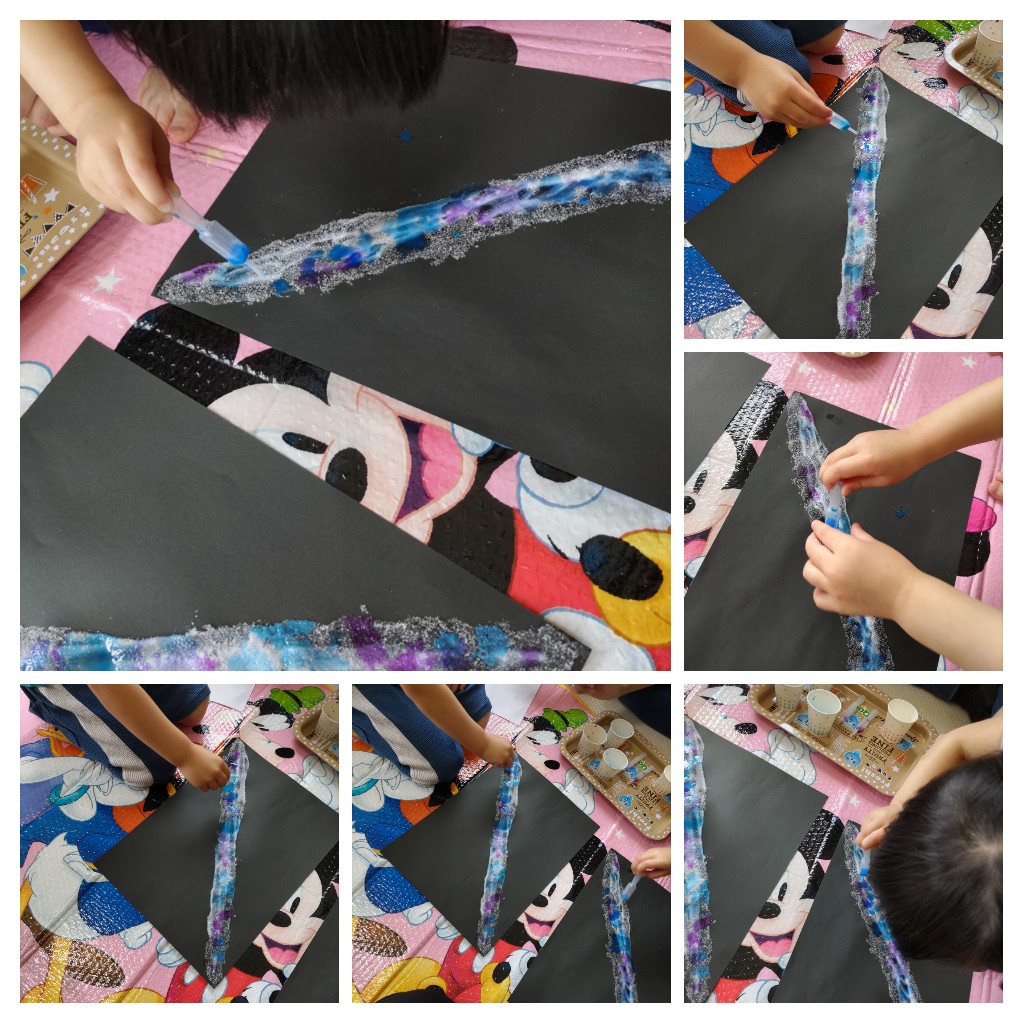 ボンドの上に塩をまき、塩の上にスポイトで好きな色を選び滲ませキレイなグラデーションが完成!!