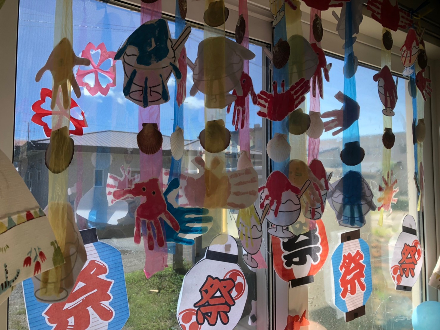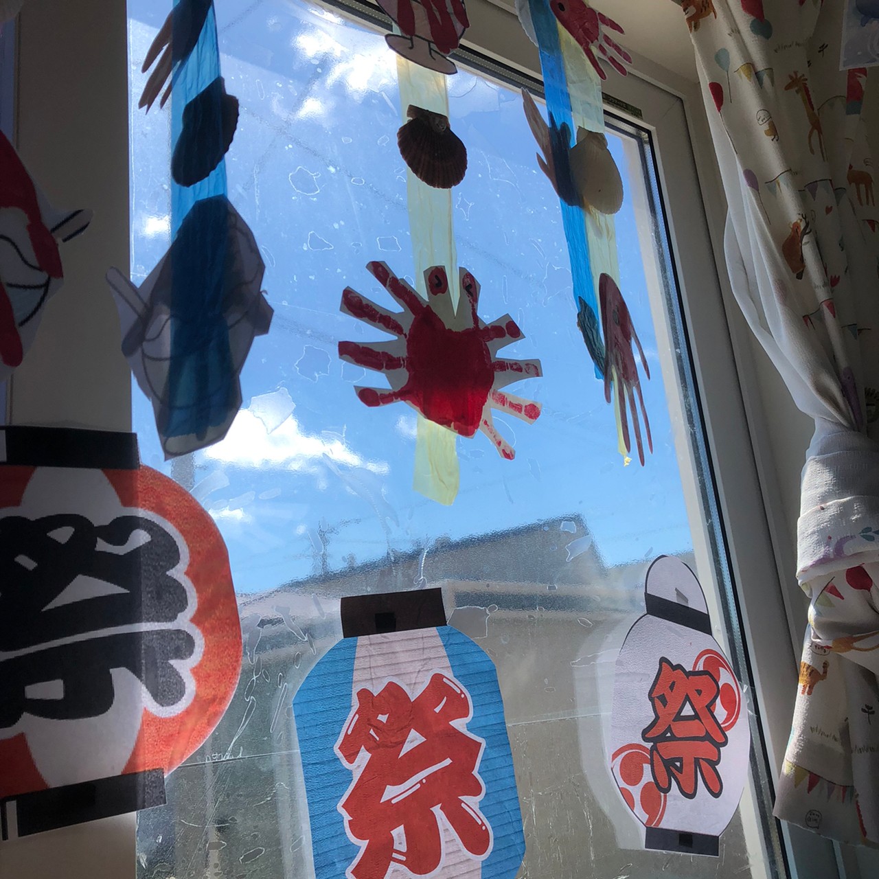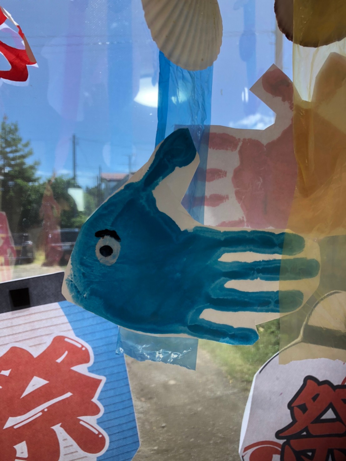 みんなの手形が、まるでガラスの向こう側の空が海に見えるような暖簾になりました(✯ᴗ✯)
