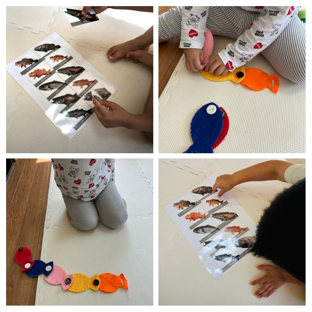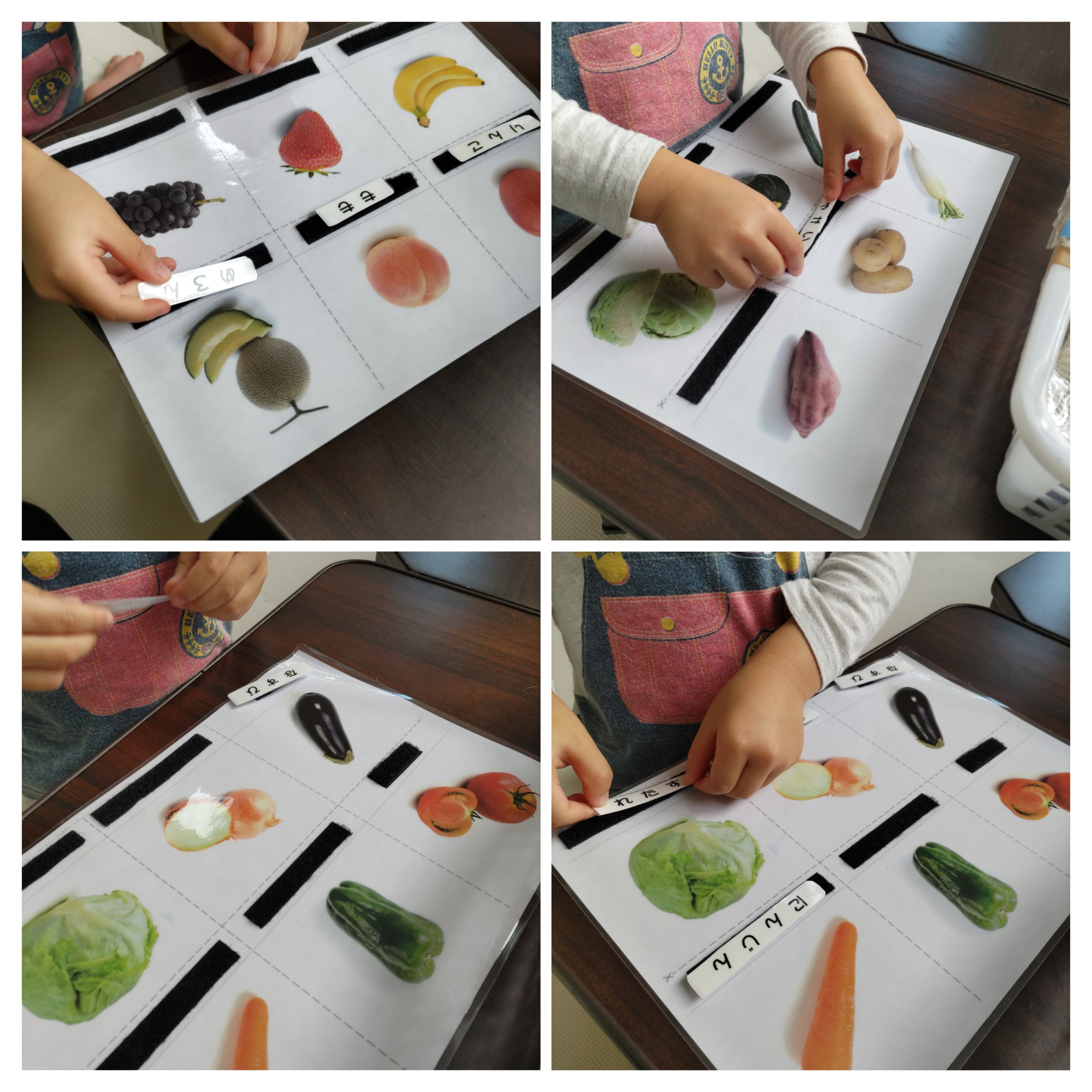お魚マッチングやボタンがけ、果物、野菜マッチングなど日常でスーパーや自宅で目にしている物を文字と写真で組み合わせ視覚からの情報と聴覚を育み認識力の向上に繋げていけるよう取り組んでます。