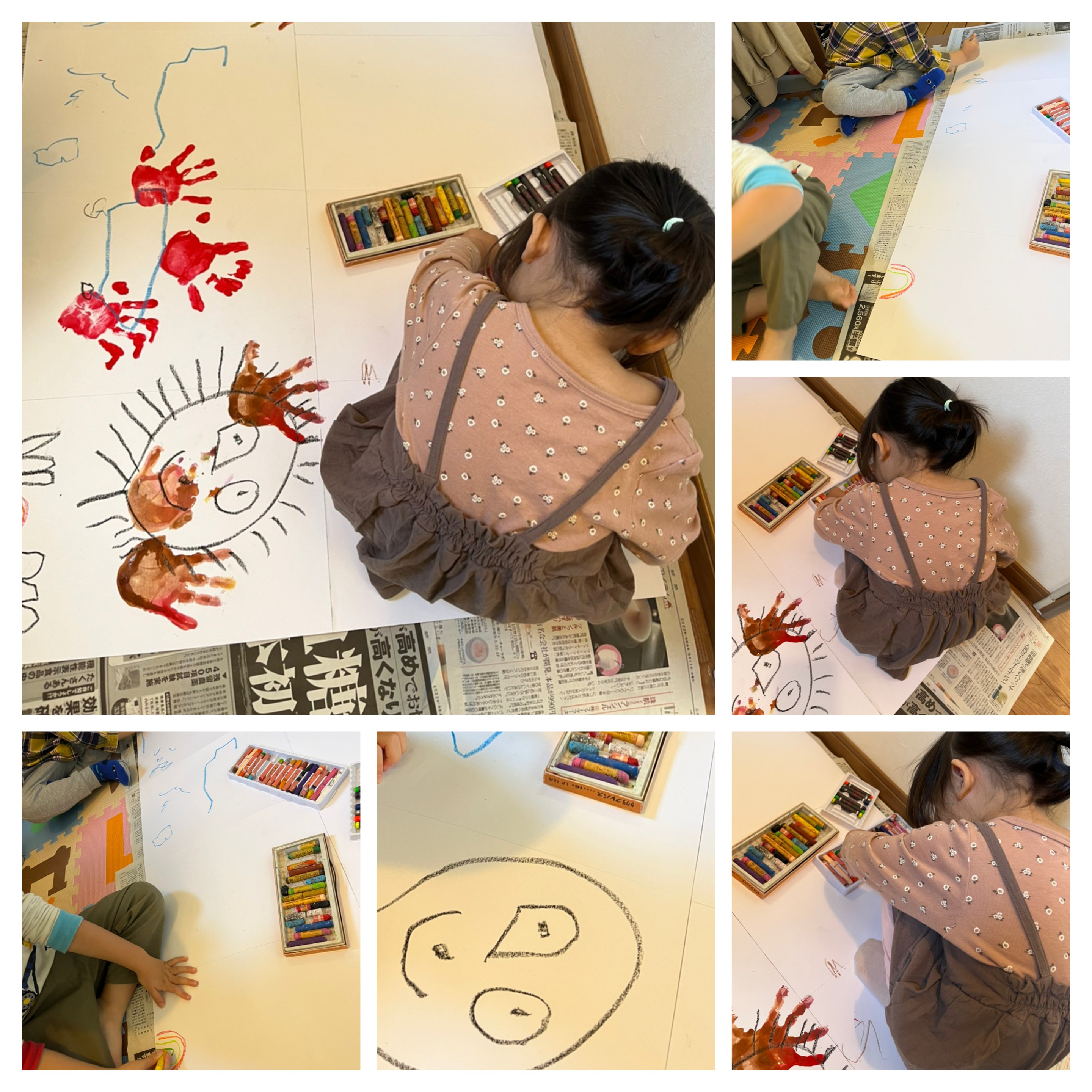 集団活動では真っ白な大きな画用紙にクレヨンや色鉛筆ポンポンスタンプを使い思いのまま伸び伸びと絵を描き手形をペタ!ペタ!