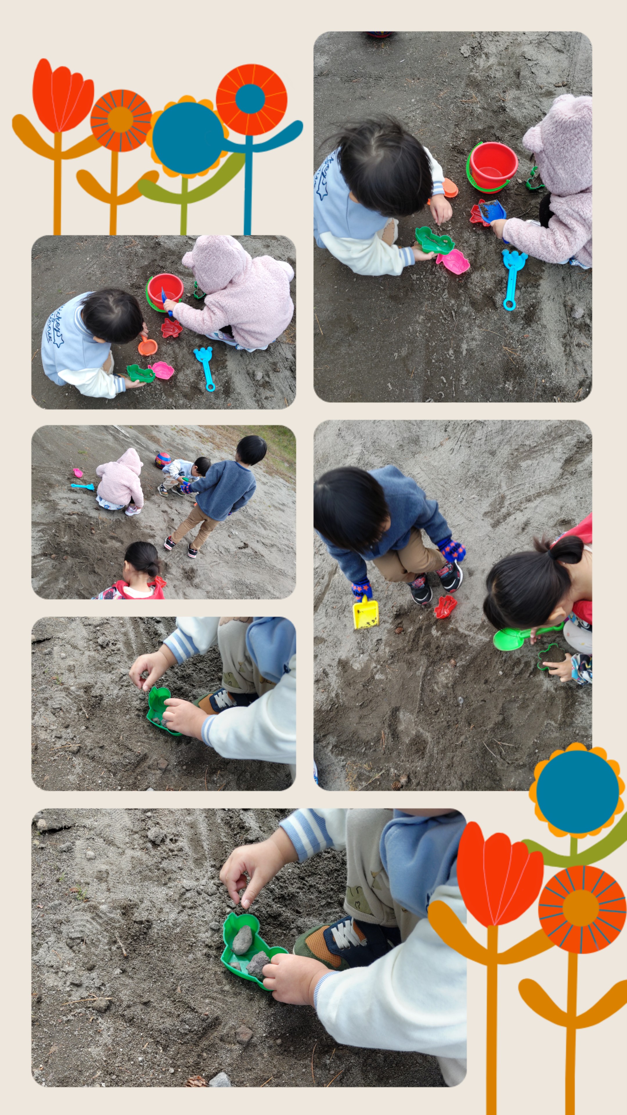 「うん!」と笑顔で一緒に初めから作り上げ完成した砂ケーキや砂の車や砂のカメを見つめて大喜び!