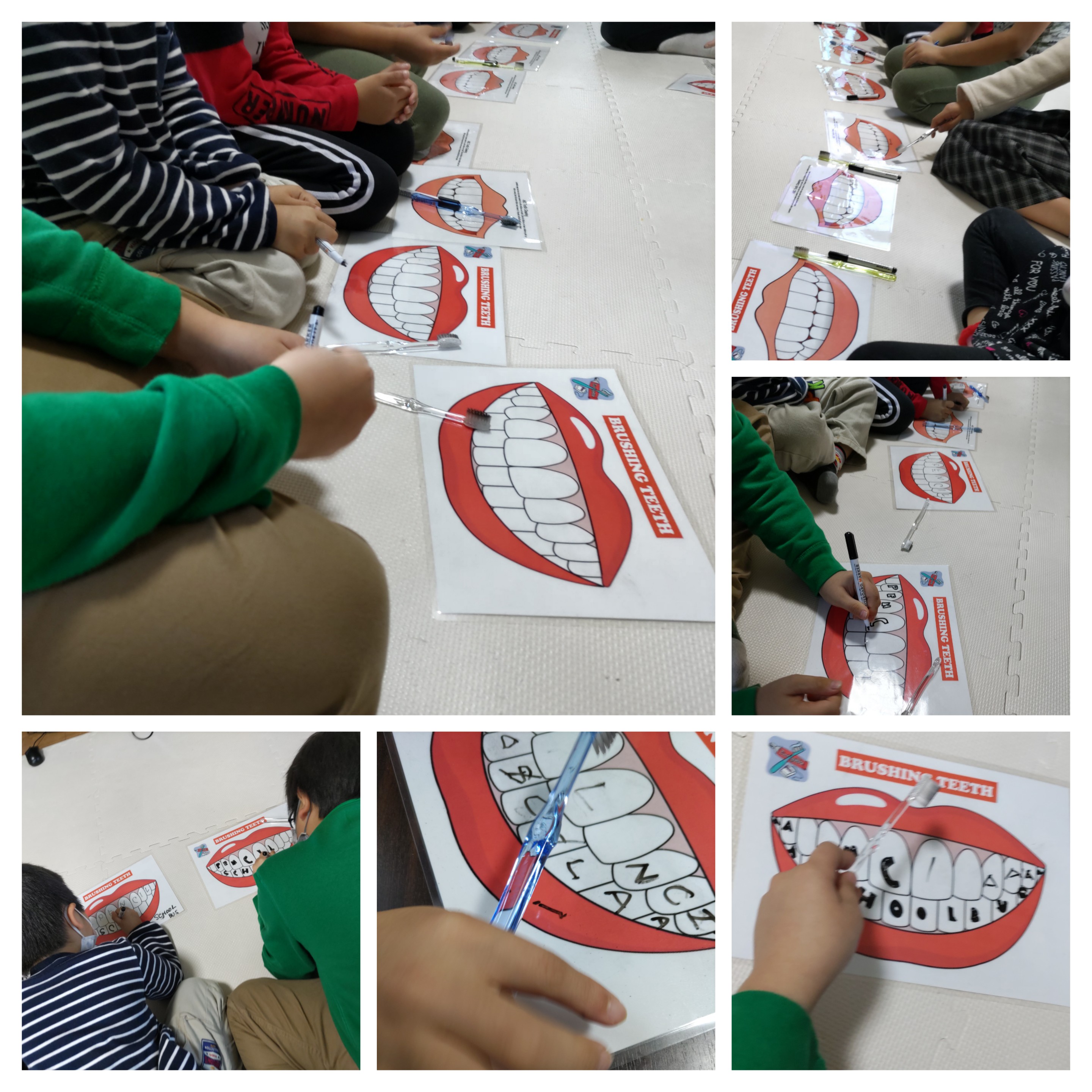 「S」と先生が発音したら復唱し歯ブラシで消していき、誰が一番早く虫歯を無くせるか楽しみながら単語や発音を覚えるレッスンは子供達に大人気です(. ❛ ᴗ ❛.)!
