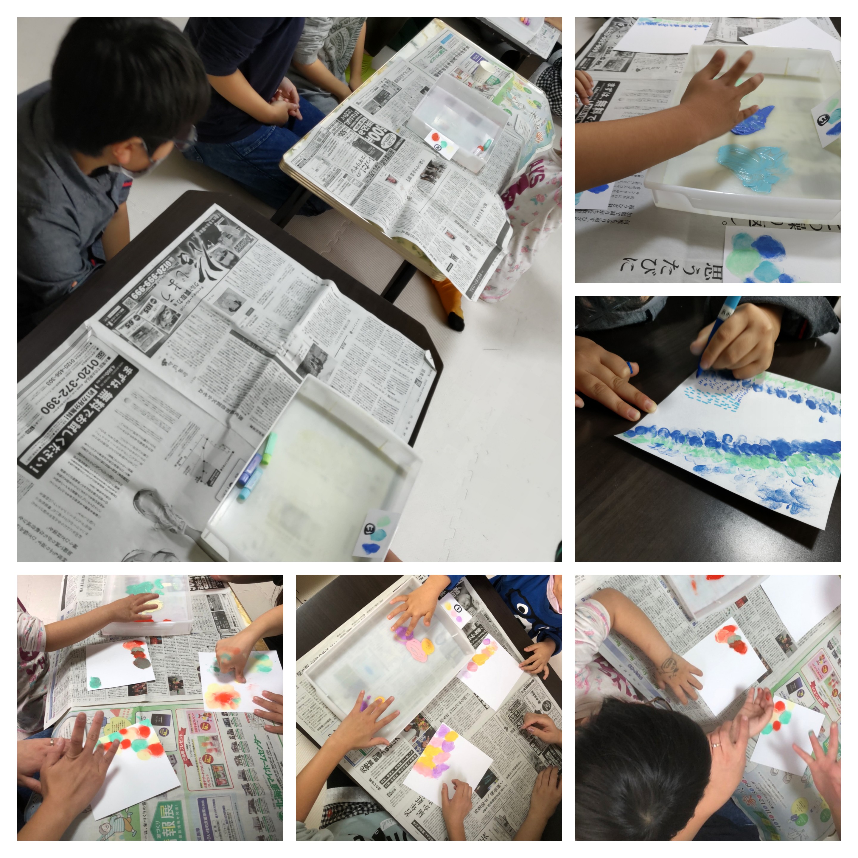 各テーブルごとに3色、色の異なった絵の具に指先をつけて紙にグルグル〜グルグル〜!