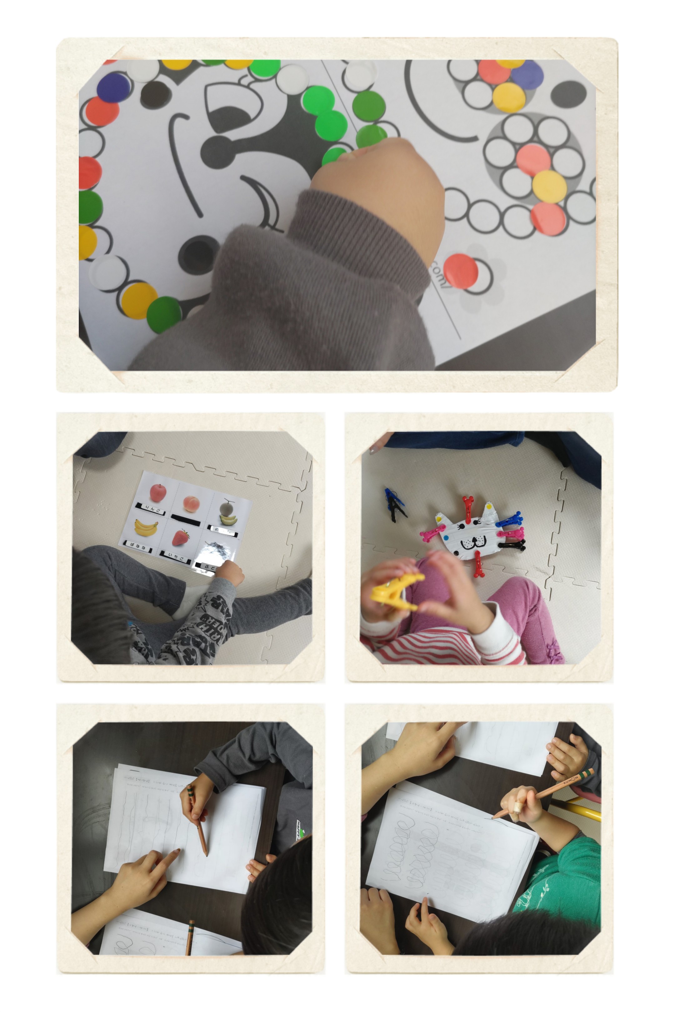 シール貼り、鉛筆の握り方の練習、線なぞり、