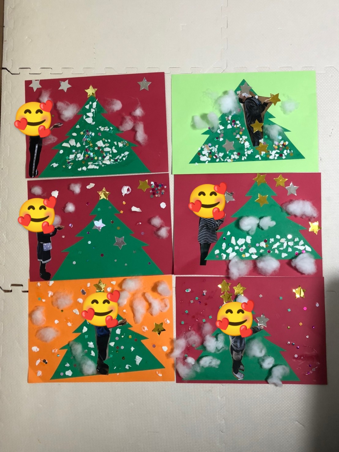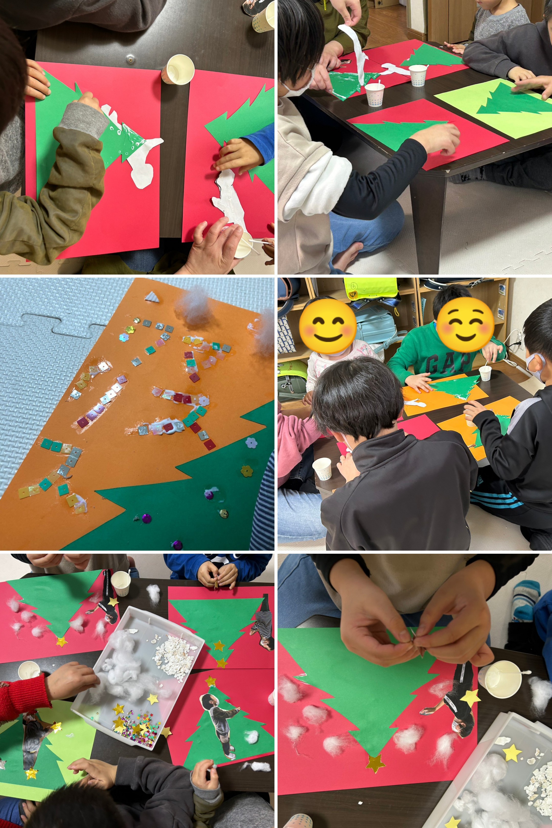 好きな色の画用紙を選んで、綿やスパンコールやホタテの貝殻を砕いたのを思い思いにペタ!ペタ!