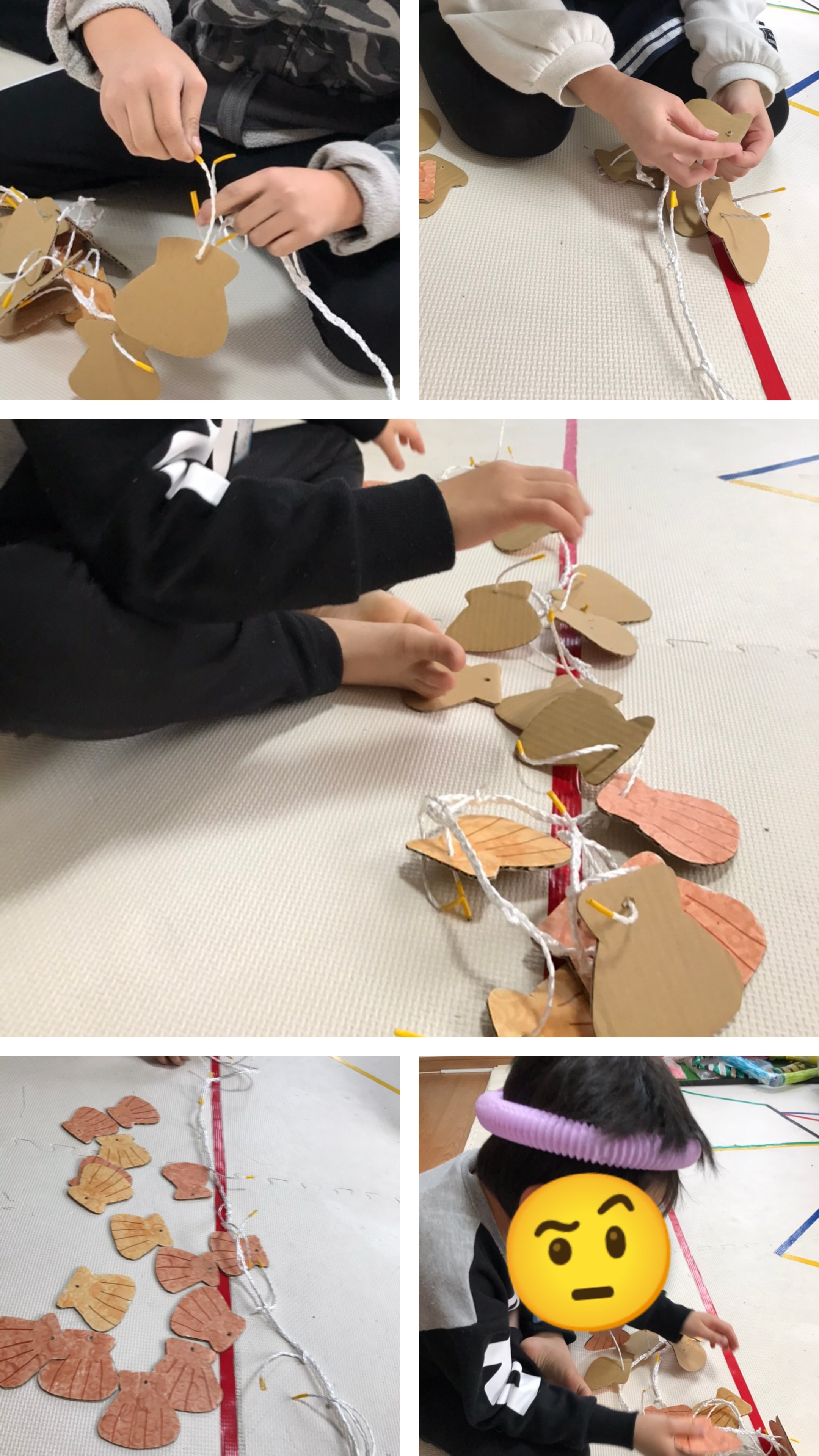 段ボールで作ったホタテを「アゲピン」式に作ったロープにつけていくタイムレース!!