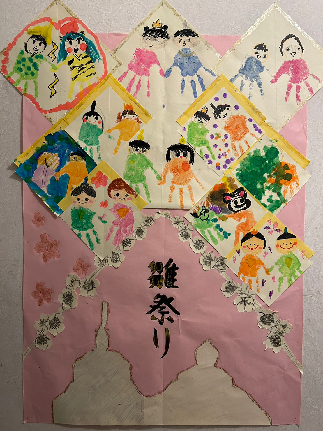 カラフルにとった手型でお内裏様とお雛様を制作!