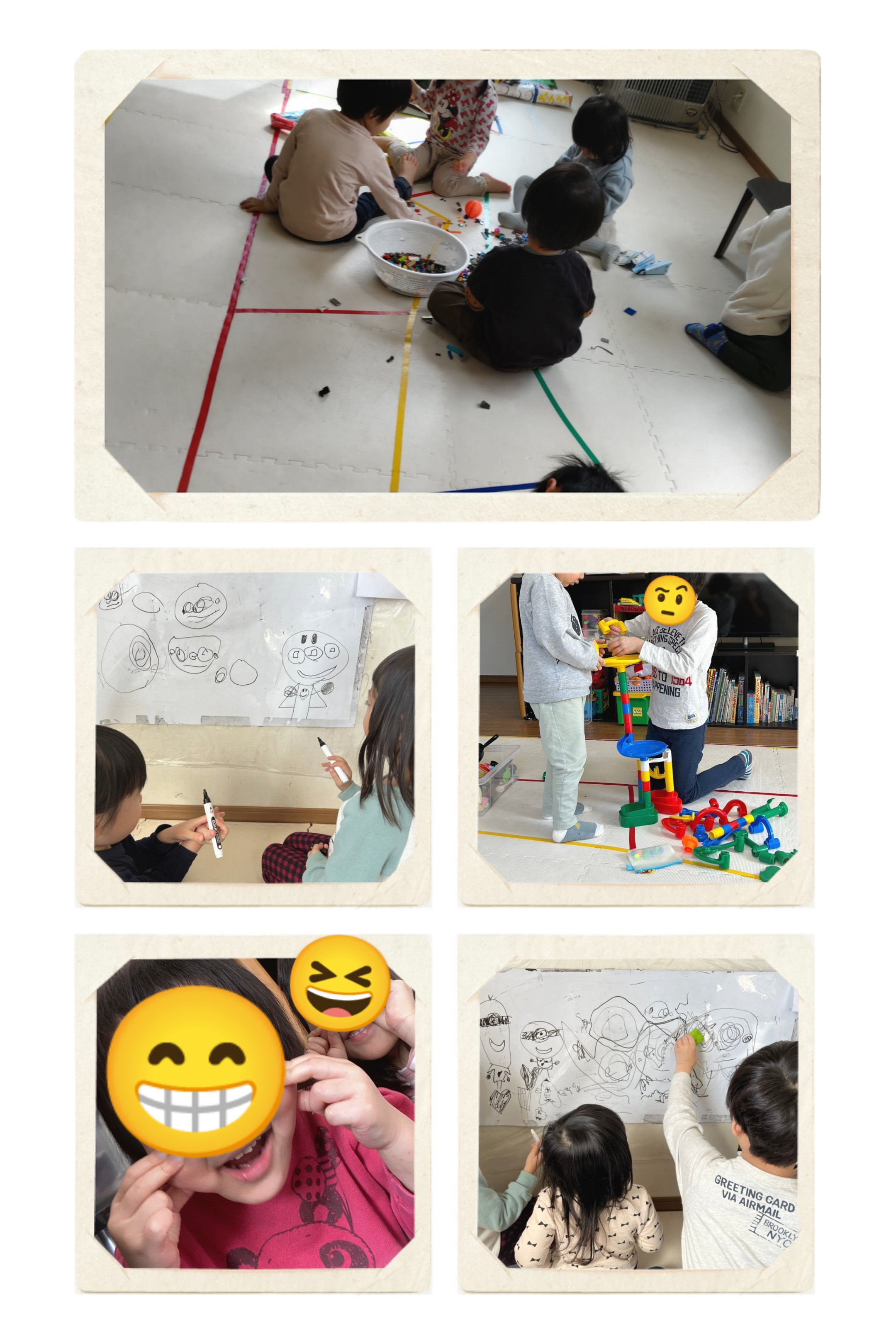 余暇時間では平行遊びや、お絵描きでアンパンマンを描きあったり、くみくみスロープを一緒に組み立てどこまで高いところからボールをうまく転がせるかチャレンジする姿が見られました(◍•ᴗ•◍)