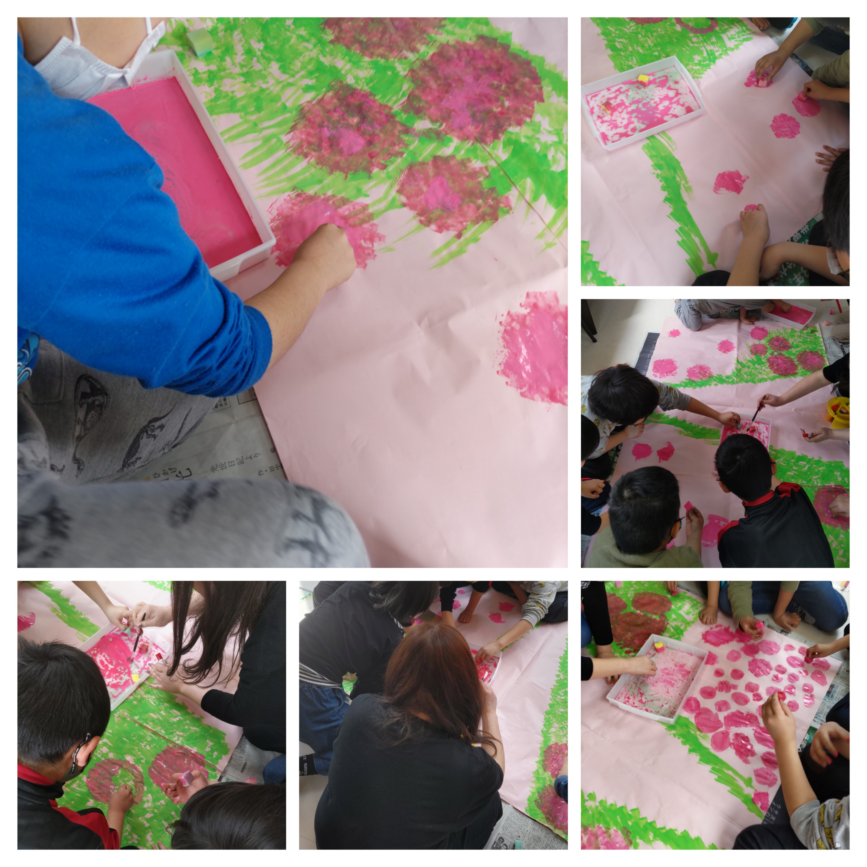 スポンジにピンクの絵の具をつけて、ポン!ポン!