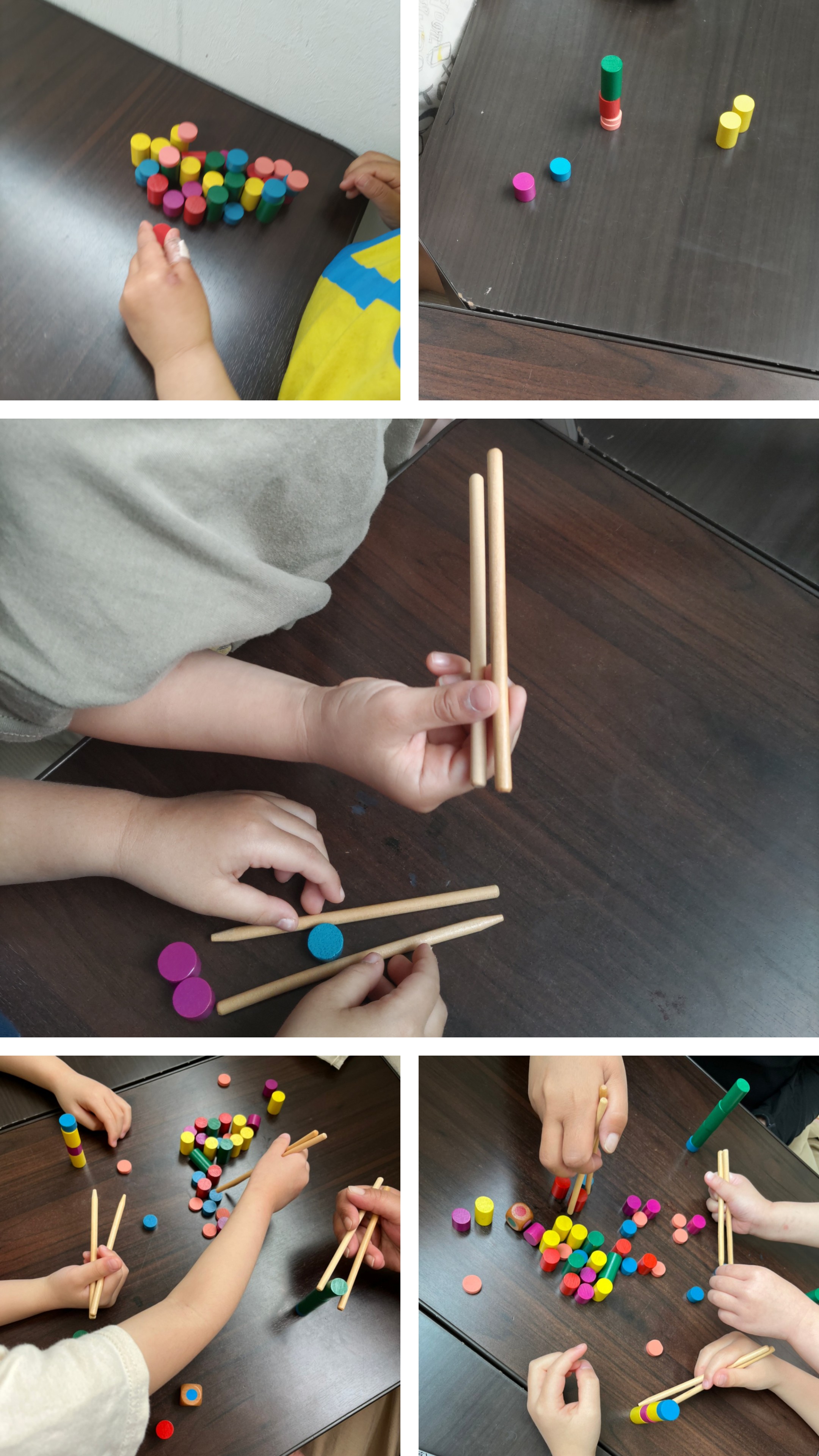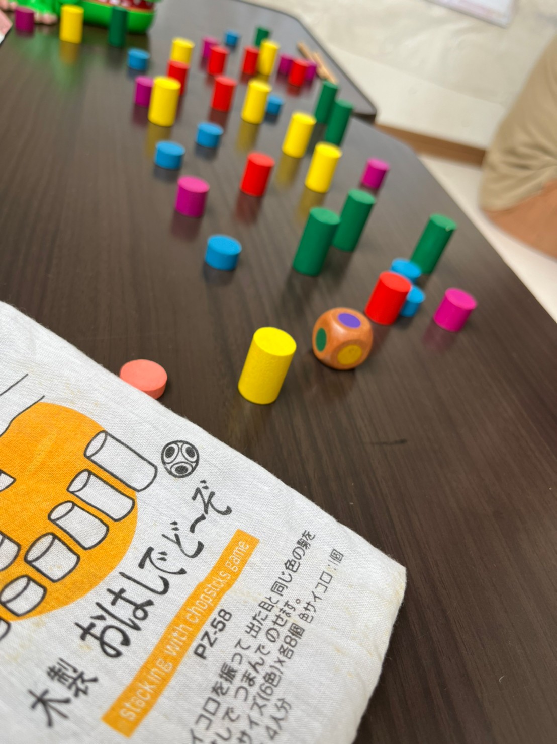 サイコロを振り出目の色と同じ色駒を箸でつまんで積み上げ誰が1番高く積み上げられるか<( ̄︶ ̄)↗
