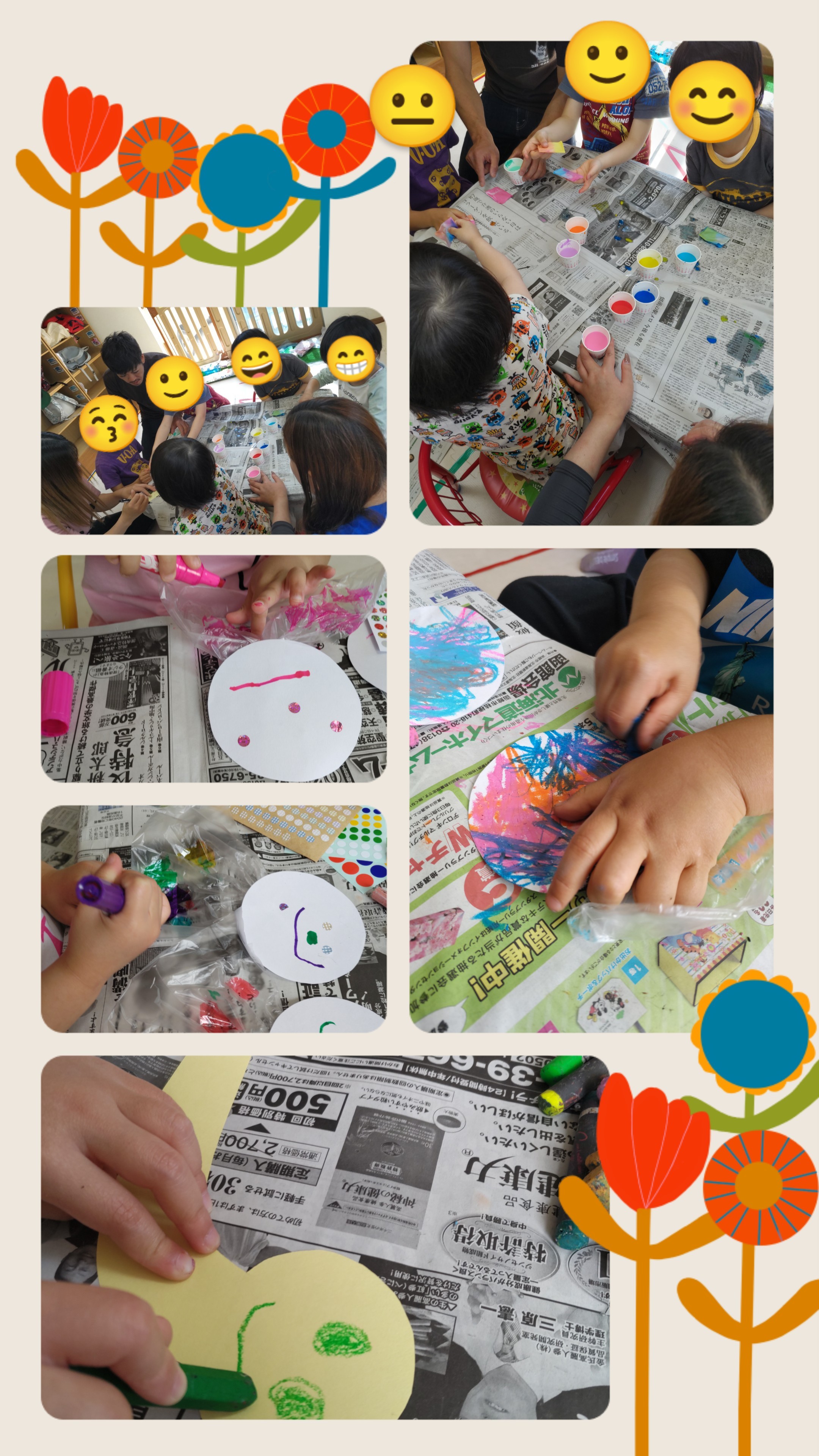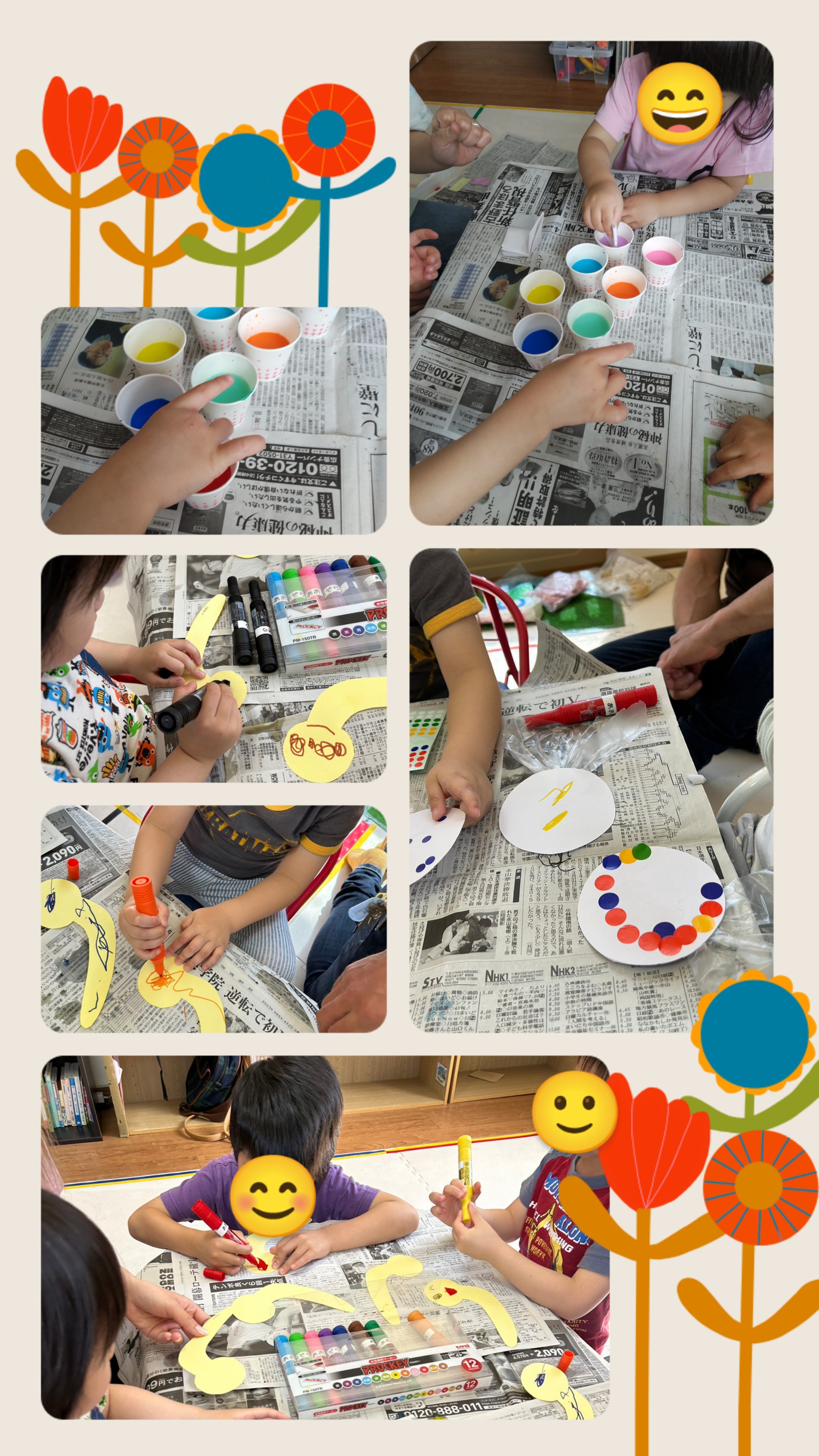 絵の具、クレヨン、マジックを使いカタツムリさんとテルテル坊主さんの顔を描きました\(ϋ)/♩